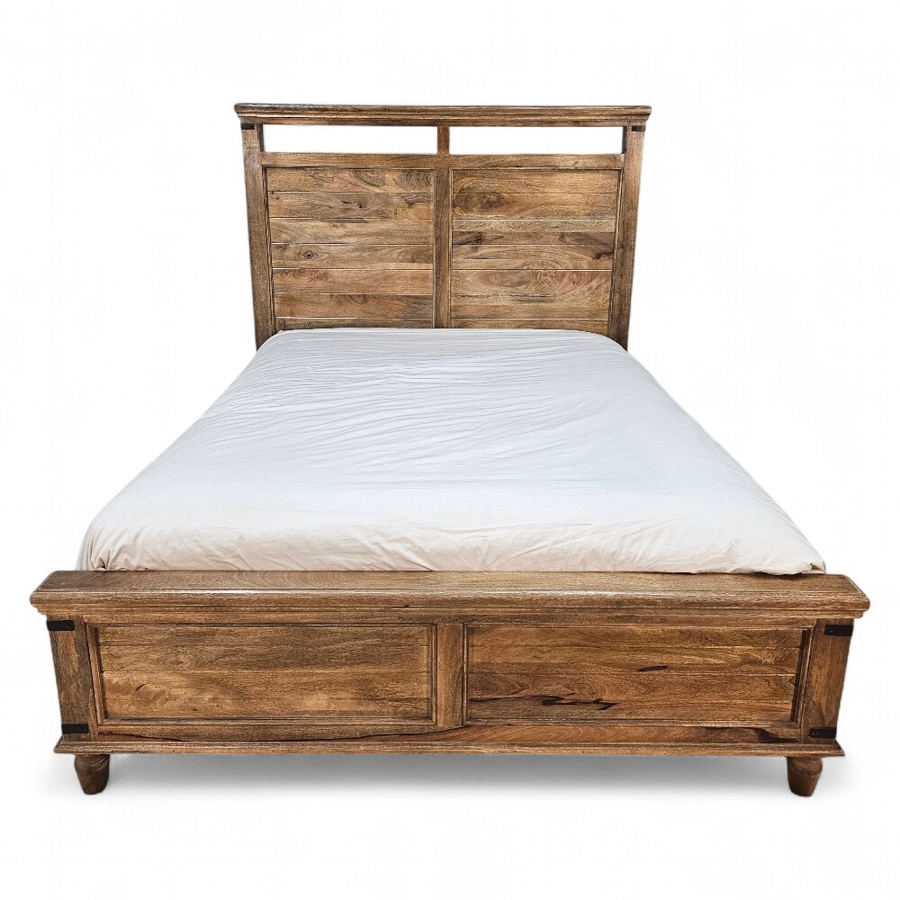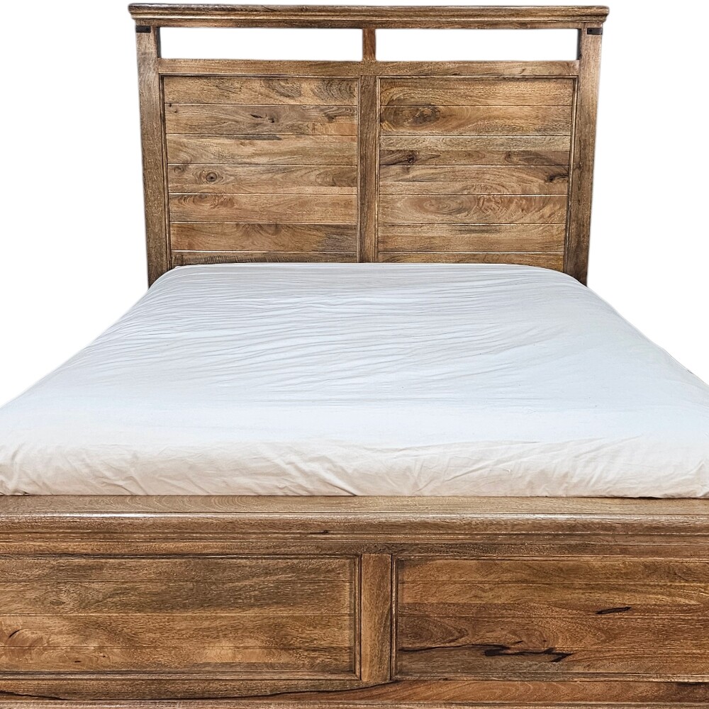 Featuring a robust, solid mango wood frame with a hand-finished natural grain and a striking slatted headboard, this bed offers a sleek, multi-tonal aesthetic for contemporary bedroom spaces