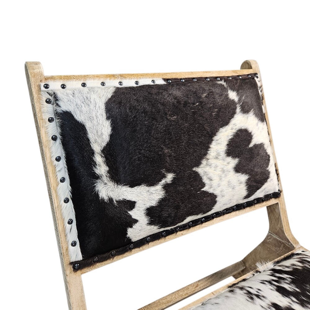The hide is expertly secured with decorative metallic stud detailing along the edges, adding an industrial touch that complements the organic textures of the wood and leather. This fusion of materials creates a sophisticated, bohemian-chic aesthetic that elevates any interior decor style, from farmhouse to urban loft