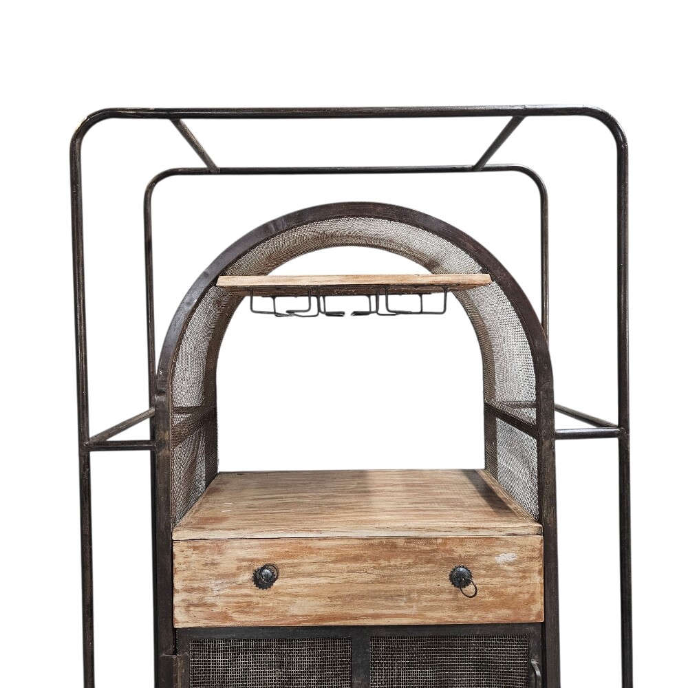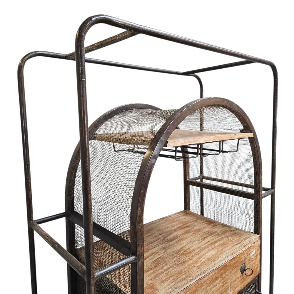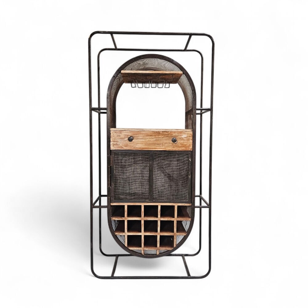 Constructed from sustainable Mango wood and a sturdy steel frame, the Indus cabinet perfectly balances rustic warmth with edgy metal detailing. The unique arched design is encased in a rectangular frame, featuring a dedicated stemware rack at the top for your glasses. Below, a central wooden drawer and mesh-fronted cabinet offer space for accessories, while the bottom section boasts a built-in wooden grid capable of holding up to 15 wine bottles