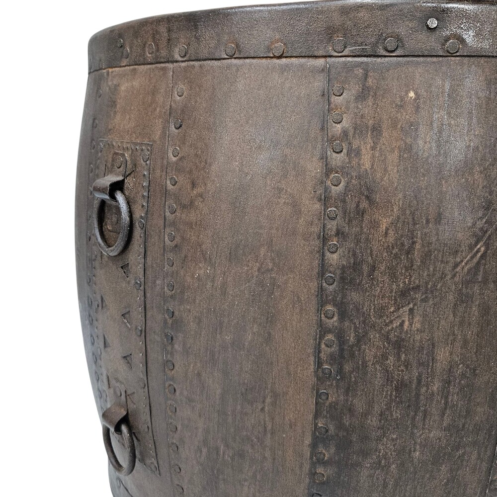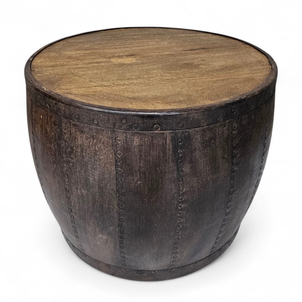 The table features a unique, barrel-like drum shape, combining a solid mango wood top with a hammered iron body, accented with decorative rivets to enhance its rustic industrial aesthetic. The dark, distressed finish adds character and depth