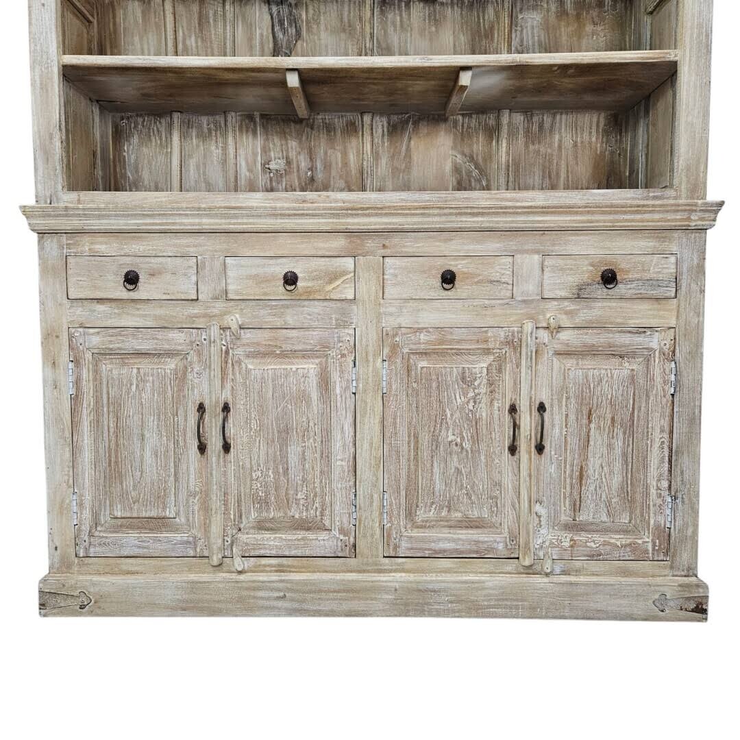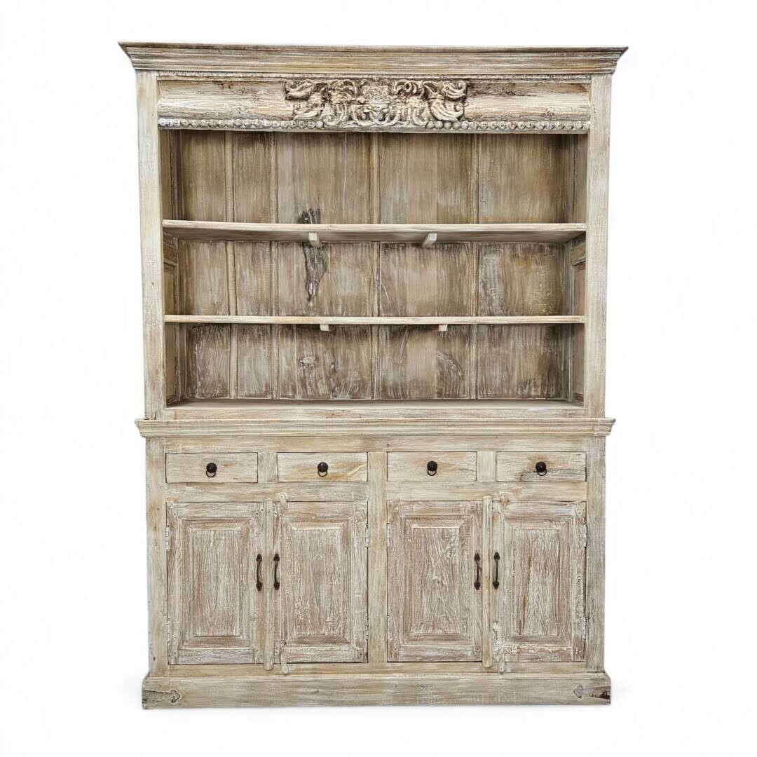 Expertly constructed from sustainable mango wood, this cabinet features a delicate whitewashed finish that accentuates its intricate hand-carved detailing, offering a harmonious blend of rustic charm and refined sophistication