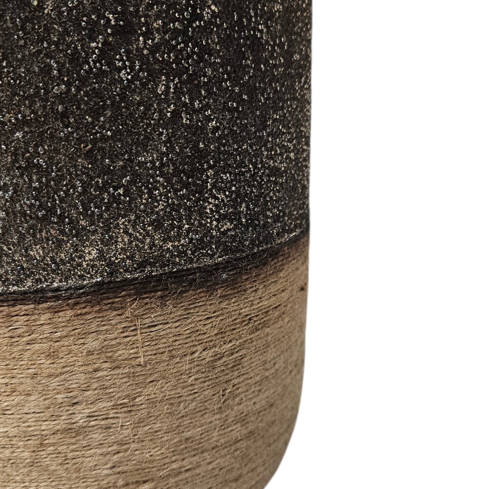 This is beautifully grounded by a thick layer of natural jute rope wrapped around the bottom half, adding a warm, rustic element that softens the metal’s appearance