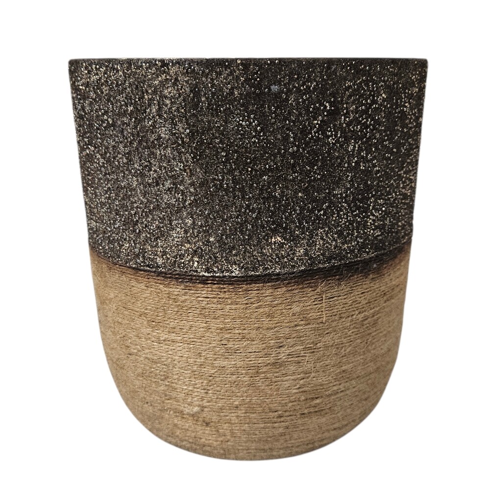 The Lainey Metal and Rope Pot measures 17cm (Length) x 17cm (Depth) x 20 cm (Height), making it a substantial decorative piece with an elegant, upright silhouette. Crafted with a sophisticated mixed-media approach, this pot seamlessly blends industrial metal with organic fibers to create a striking textural contrast