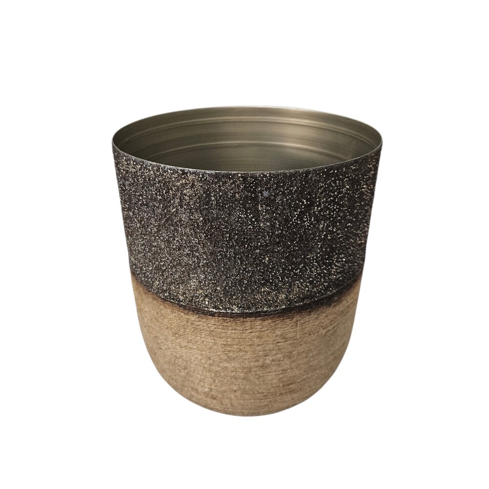 This pot embodies a modern bohemian aesthetic, featuring a distinct two-toned design. The upper portion of the pot is made from metal with a dark, pebbled finish that offers a subtle metallic shimmer and industrial edge