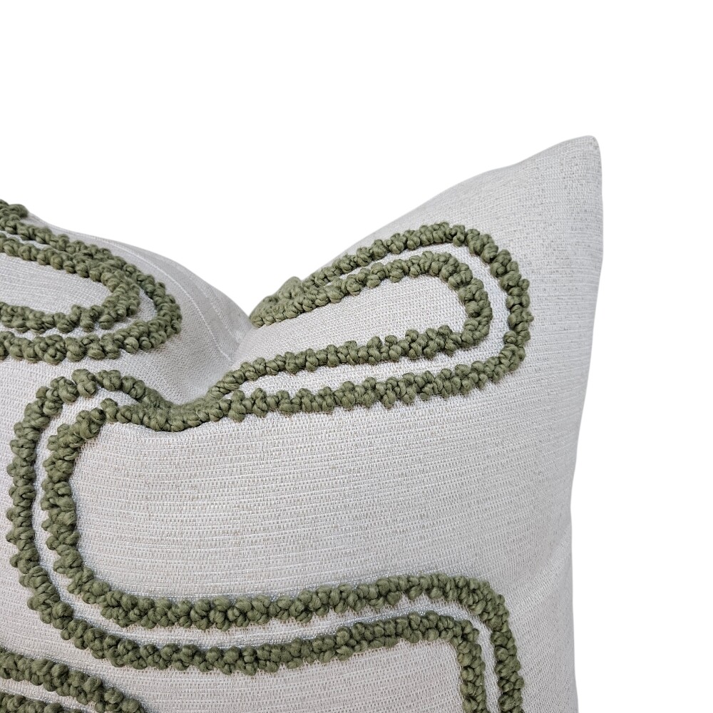 This scatter cushion is a masterpiece of contemporary textile craftsmanship, featuring a rhythmic, abstract landscape-inspired pattern. The design is brought to life through an intricate “punched” embroidery technique, creating raised, plush segments in an earthy sage green tone. These organic, flowing shapes stand out against the soft cream woven base, providing a bold architectural look that mirrors the natural contours of a horizon while remaining versatile enough for modern, global, or bohemian-chic interiors