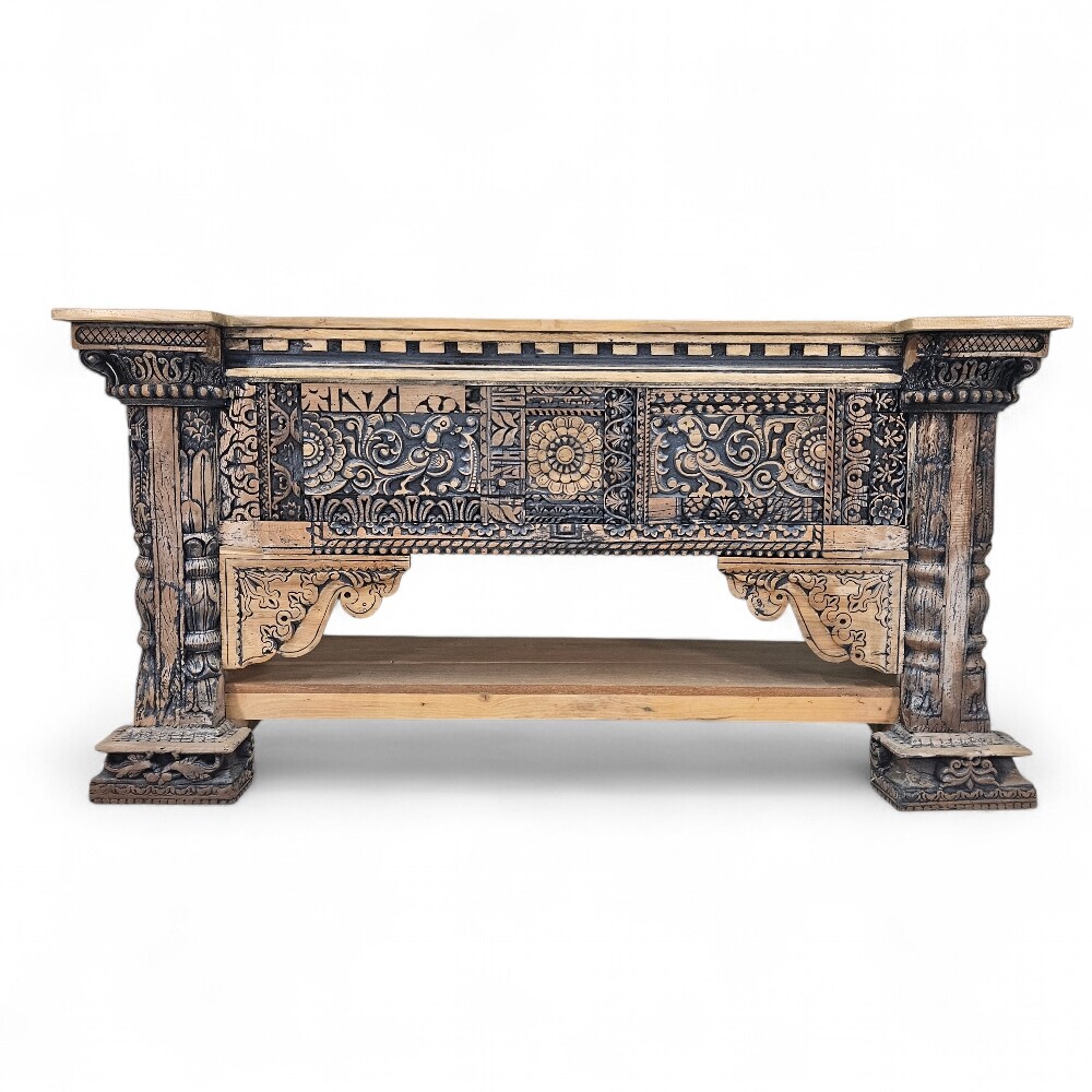 Anchor your living space with the magnificent Lazuli Carved Console Table, a monumental example of handcrafted mango wood furniture that exudes architectural grandeur