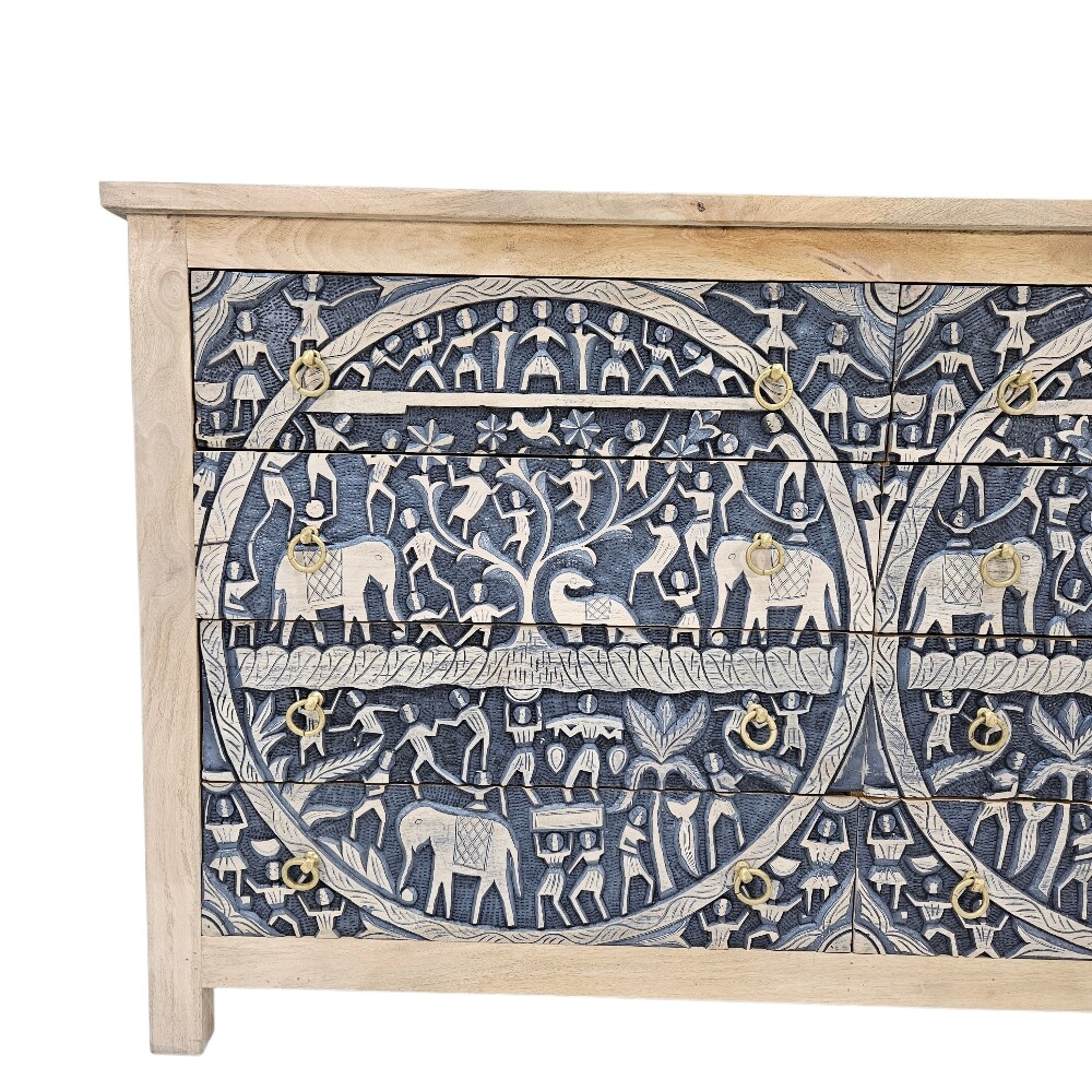 Make a bold, artistic statement in your home with the Lazuli Dresser, a masterpiece of hand-carved mango wood furniture that bridges the gap between functional storage and fine art