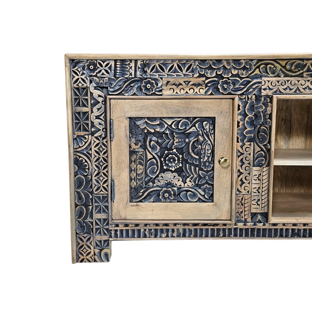 Constructed from solid mango wood, every surface of this media console is richly decorated with intricate, multi-layered hand-carved detailing, featuring a stunning array of floral and geometric motifs