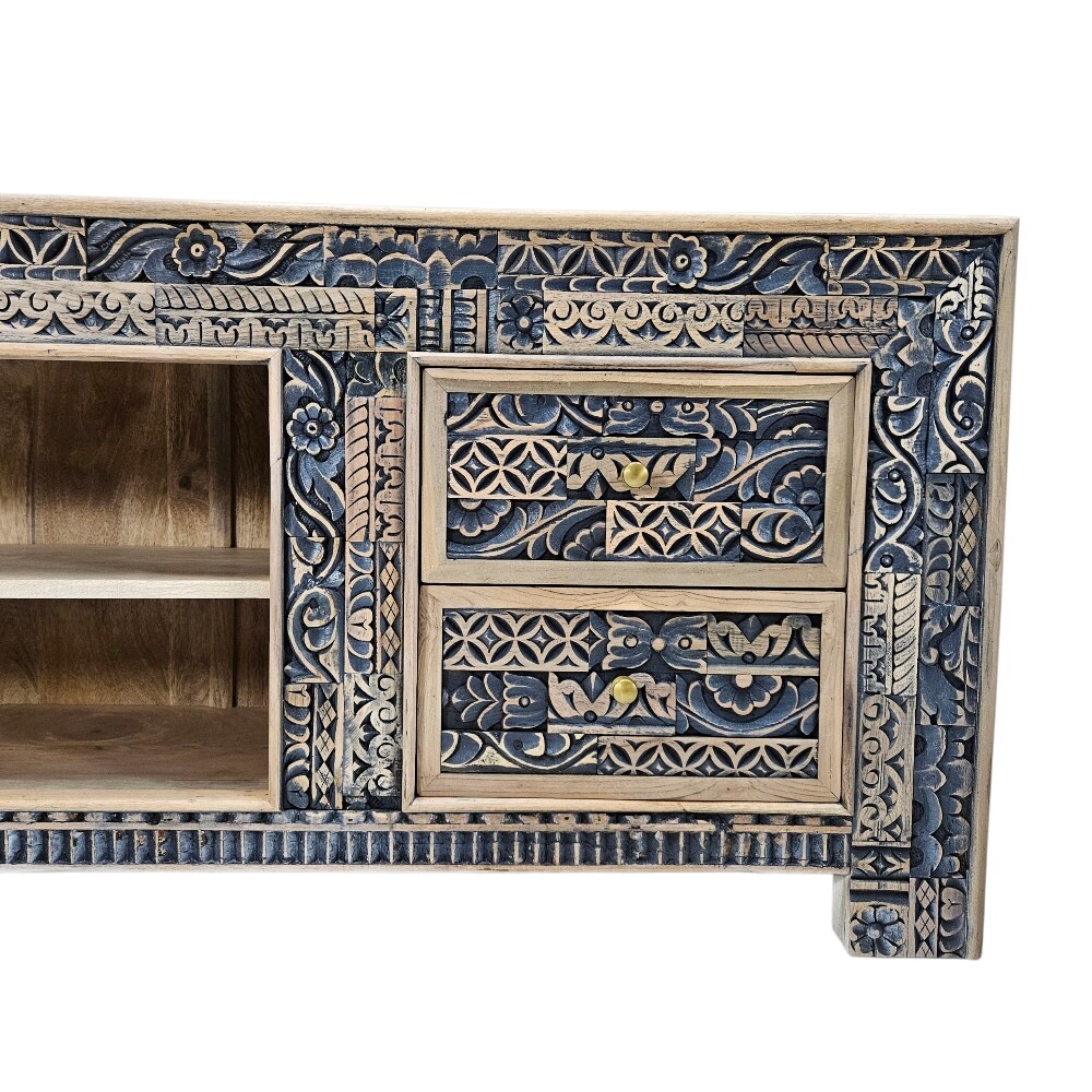 This Bohemian-style piece is finished in a distressed two-tone effect, highlighting the depth of the carving. The functional layout includes one single-door cupboard, two central open shelves perfect for media players, and two convenient storage drawers, ensuring all your cables and devices are neatly managed while introducing a high-end, vintage-inspired style to your living room or media space