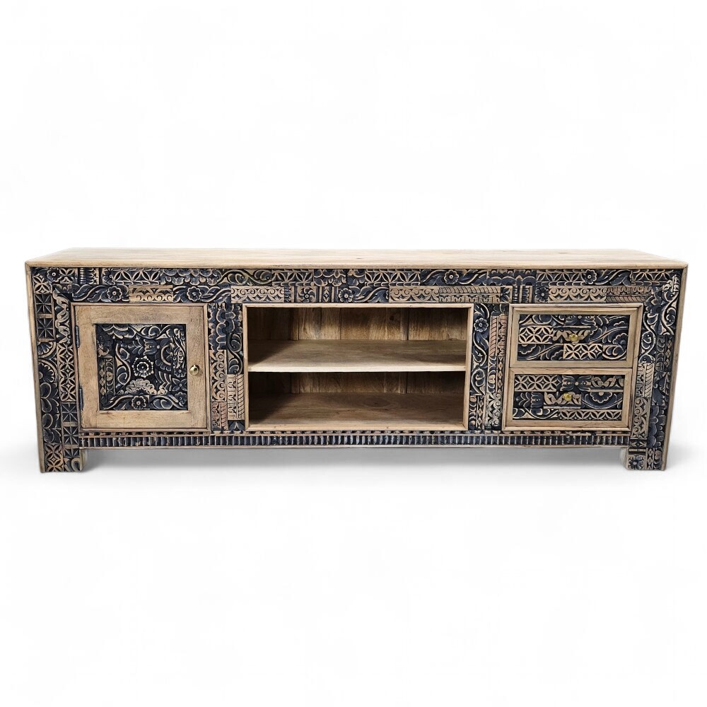 This magnificent Lazuli Carved Plasma TV Unit is an extraordinary piece of handcrafted furniture that instantly transforms your entertainment area into a focal point of artistic global design. It offers substantial, organized storage for all your media components and accessories