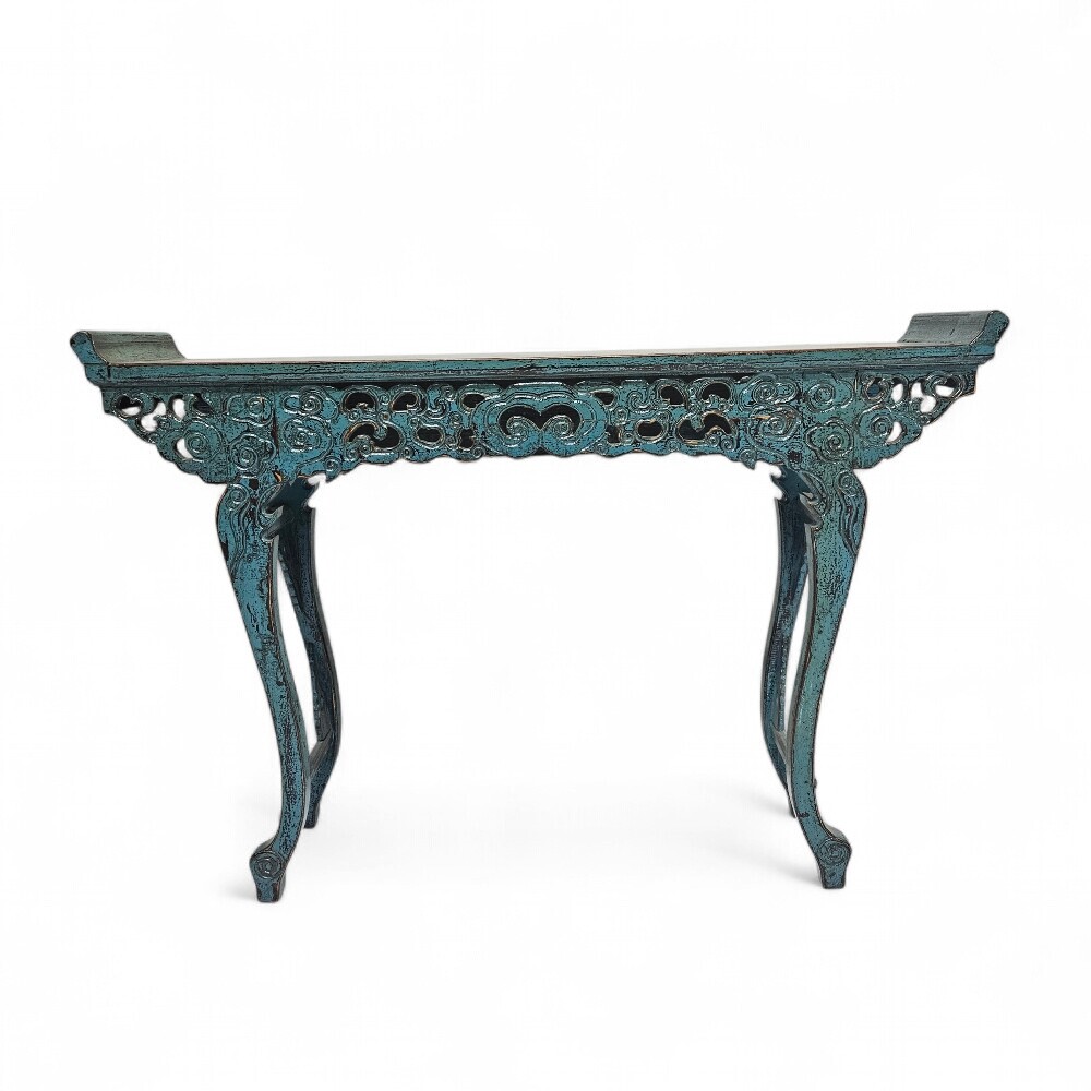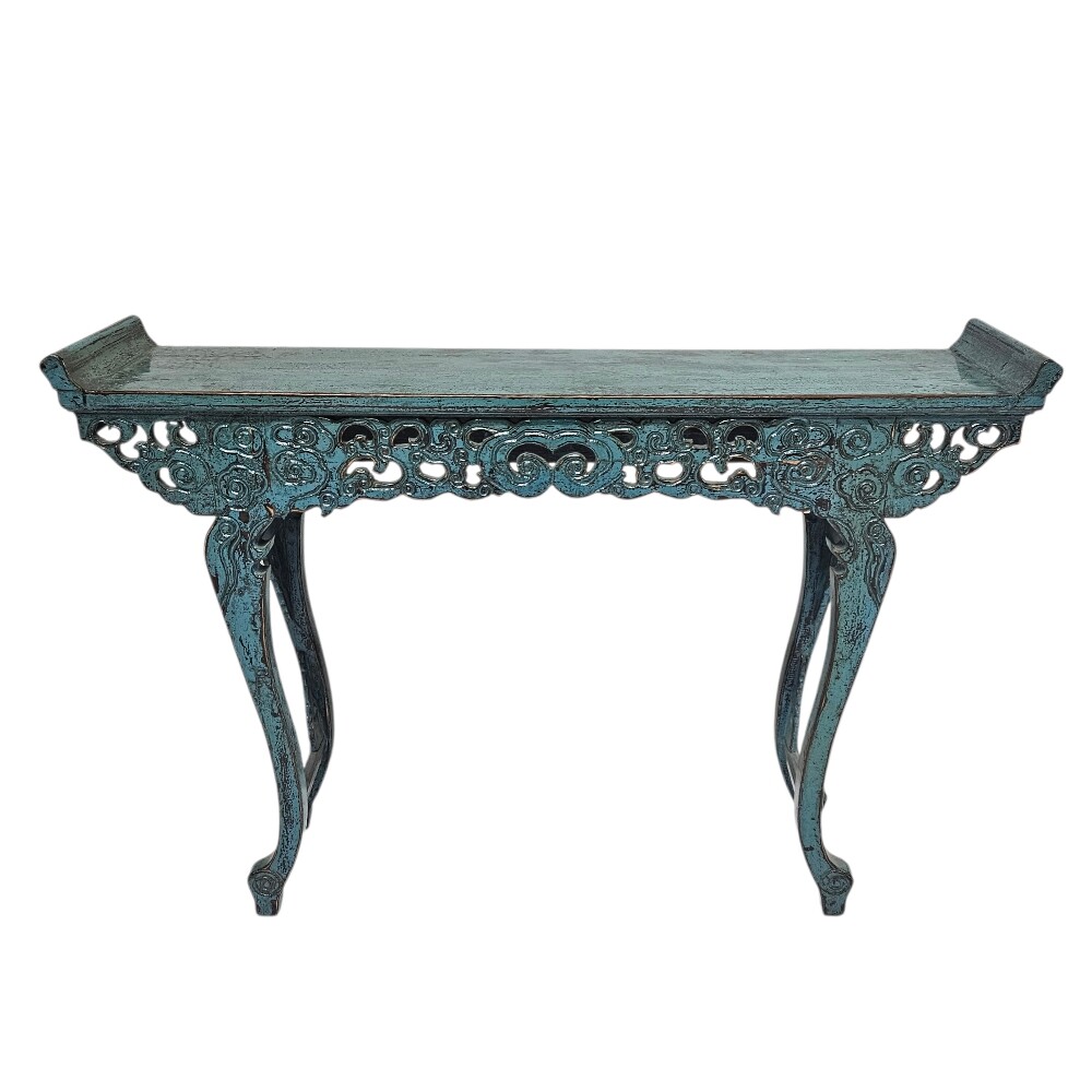 This organic 130cm (Length) x 30cm (Depth) x 85cm (Height) Lian Carved Elm Console Table is a masterful expression of Eastern-inspired craftsmanship and bold contemporary design, finished in a striking high-gloss blue paint to bring a sophisticated, vibrant rhythm to your entryway or narrow hallway