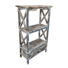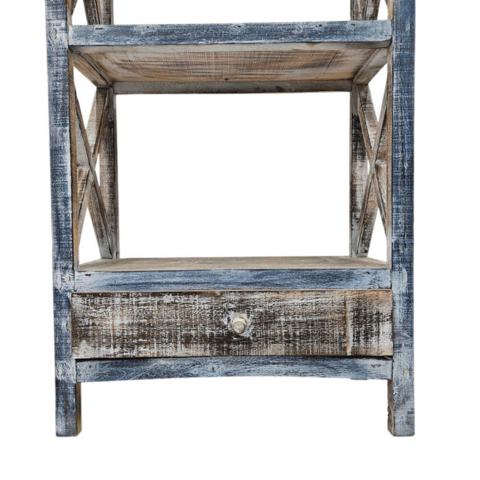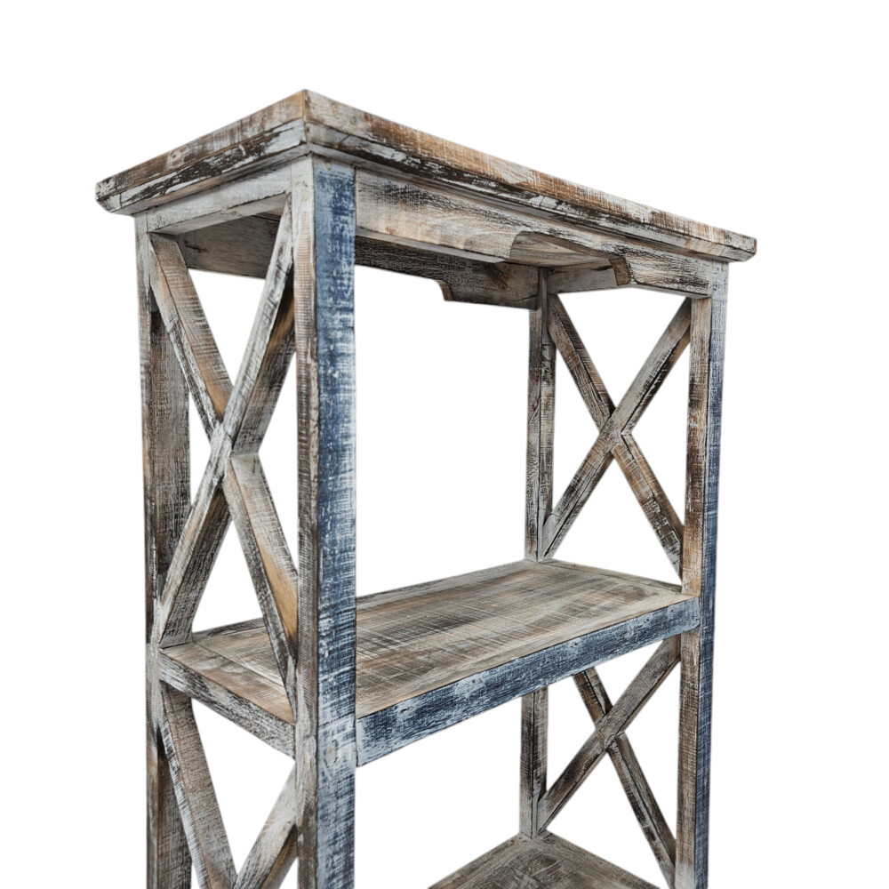 Its weathered finish brings a charming vintage feel to any room, while the open shelves provide ample space to display books, plants, or decorative accents