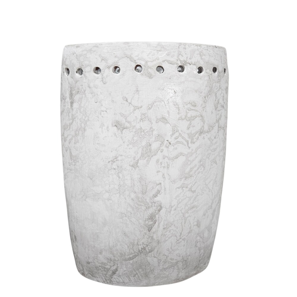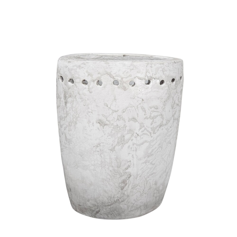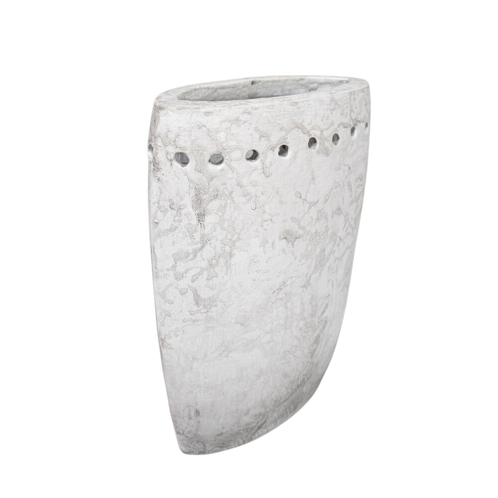 This vase is finished in a crisp, matte white with a subtle stone-like texture that emphasizes its clean and modern aesthetic. Its unique, flattened oval silhouette is elevated by a row of small, precision-perforated holes near the rim, lending it an artisanal, hand-crafted feel