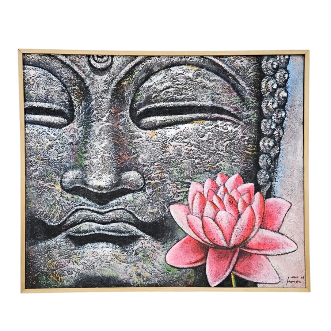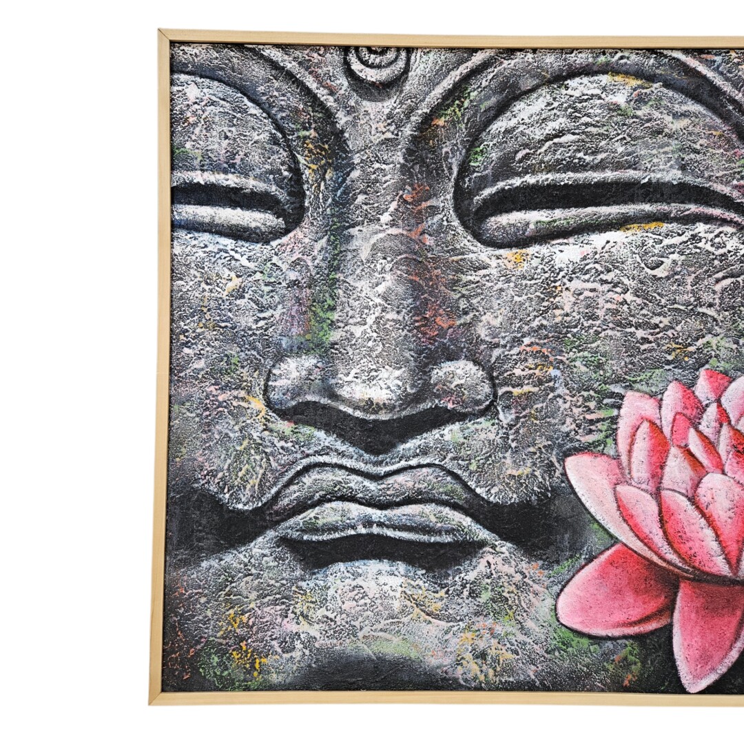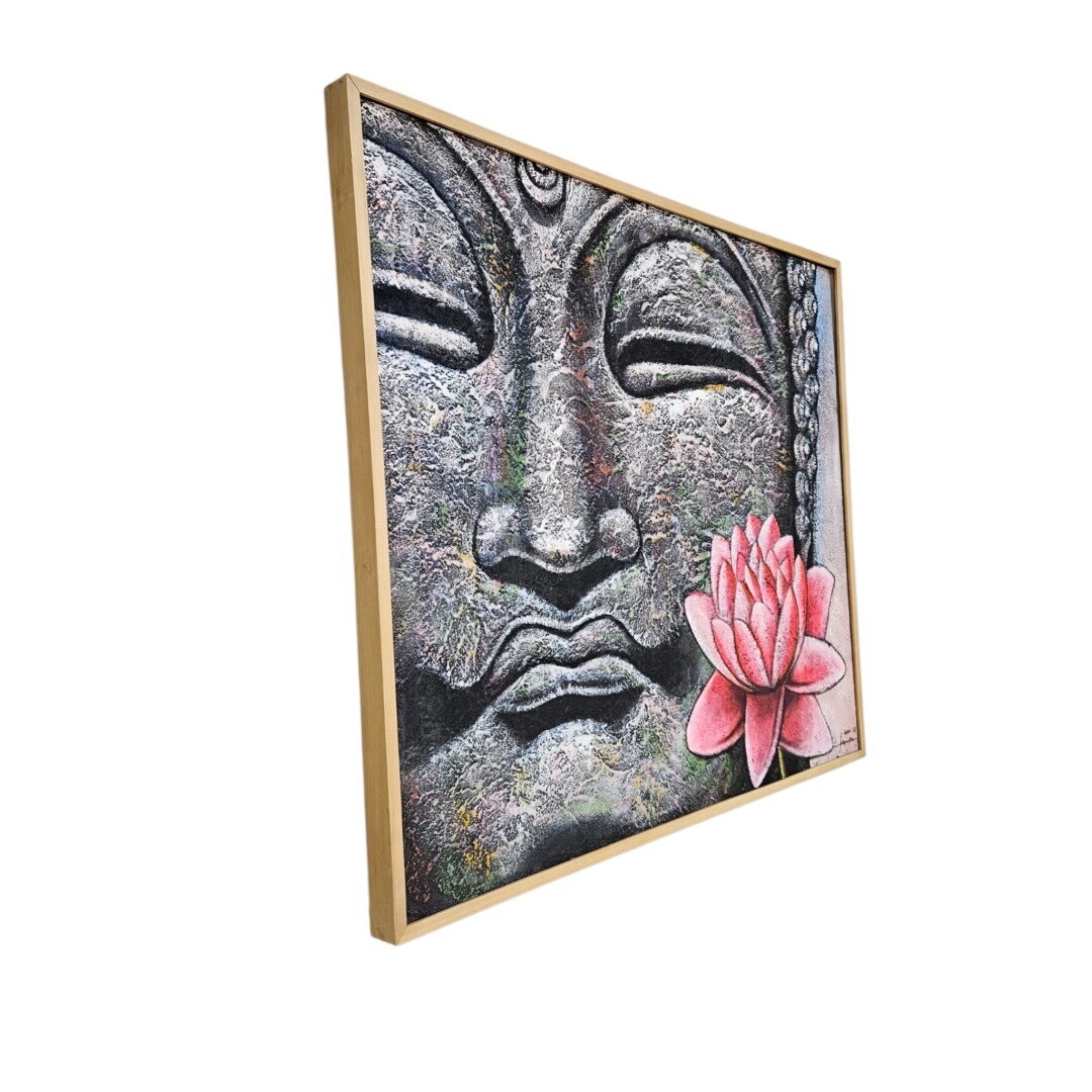 The composition serves as a captivating centerpiece, showcasing a close-up, stone-textured portrait of the Buddha in soft greys, dramatically contrasted by a vibrant, hand-painted pink lotus flower. Its rich, tactile surface is achieved through heavy impasto techniques and subtle washes of moss green and earthy ochre, giving the piece a soulful, artisan quality.