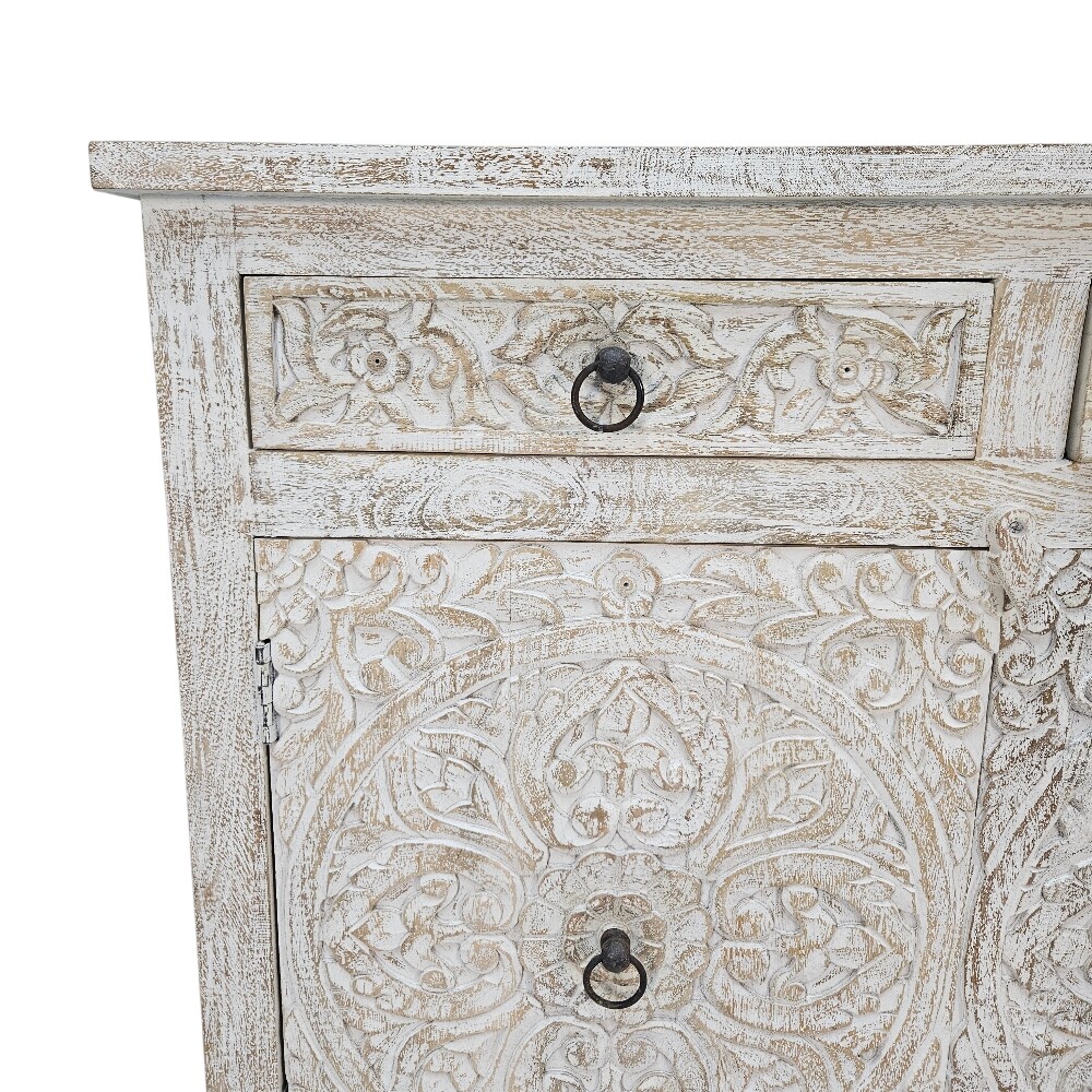 The true highlight of this wooden cabinet is the elaborate, hand-carved floral lotus motif that spans across the two large cupboard doors and two upper drawers