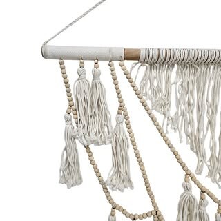 Measuring 120 cm (W) x 140 cm (H), this statement piece is handwoven with care, featuring intricate knotting, cascading layers, and natural wooden beads that lend a boho-inspired elegance to any room