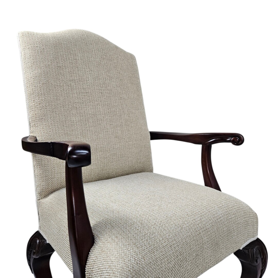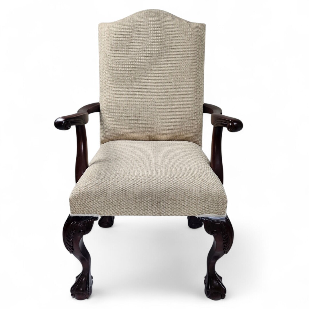 The chair’s frame is constructed from solid mahogany, a premium hardwood prized for its deep, rich color and structural integrity, ensuring that this piece is built to last for generations. The design showcases quintessential Chippendale elements, most notably the intricately hand-carved ball-and-claw feet and the gracefully curved cabriole legs. The broad, upholstered seat and high backrest are covered in a durable, textured neutral fabric that offers a sophisticated contrast to the dark wood. The flared armrests provide comfortable support, echoing the chair’s overall formal elegance
