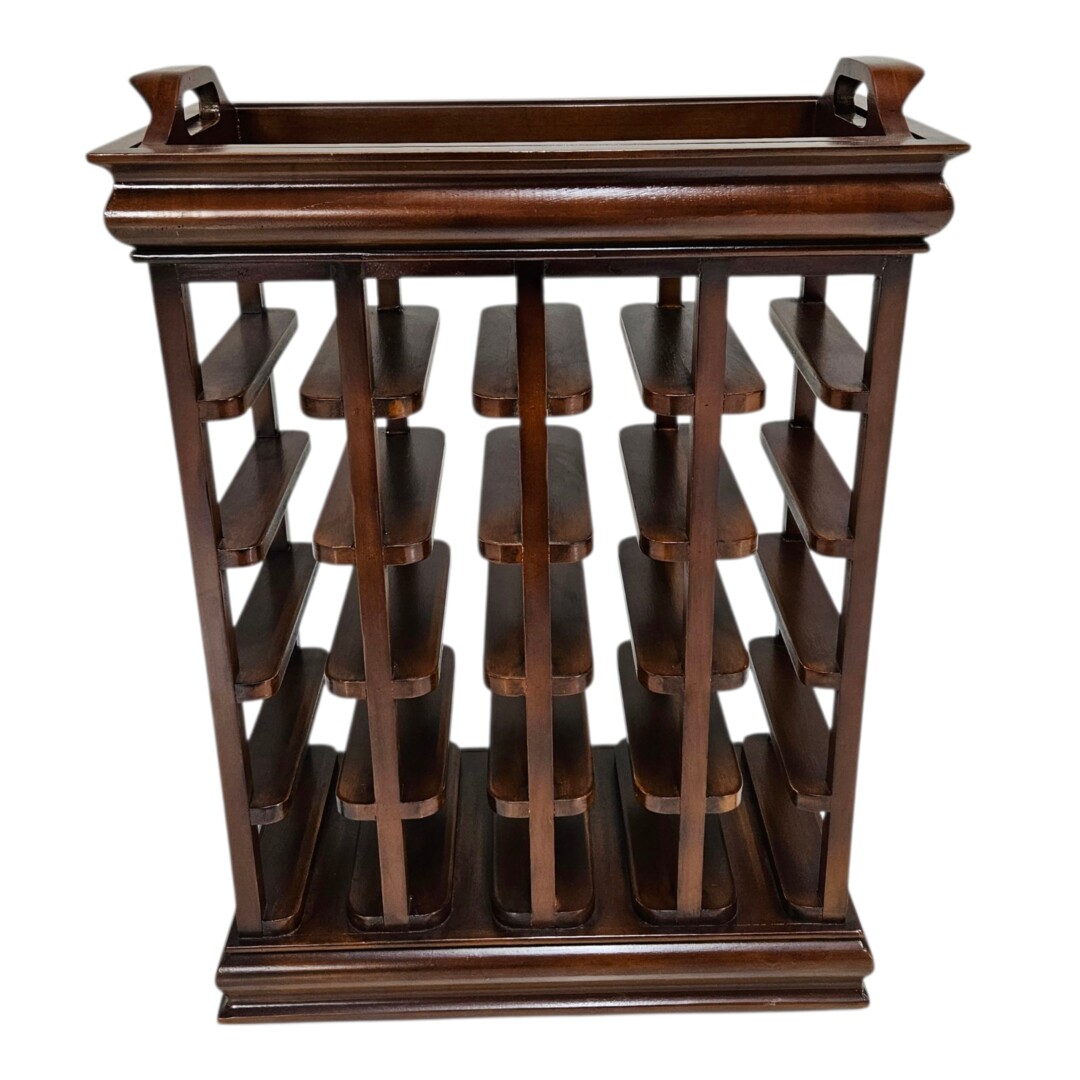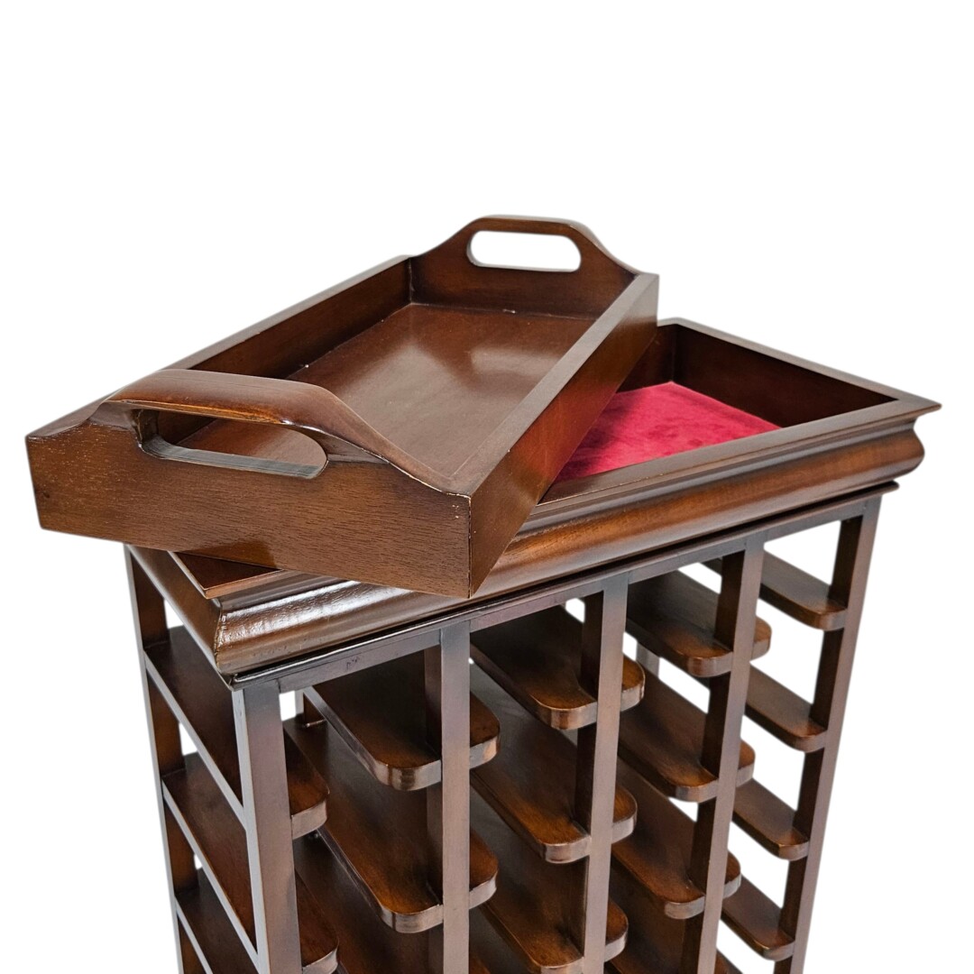 Constructed from solid mahogany, the rack is finished in a deep, lustrous hue that ages beautifully and complements formal decor. The open vertical design securely holds bottles horizontally, which is essential for keeping corks moist. The crown molding top cleverly integrates a removable, deep serving tray with cut-out handles, perfect for transporting glasses, bottles, or small appetizers. The interior of the tray is lined (as shown in the close-up image), adding a layer of protection and luxury