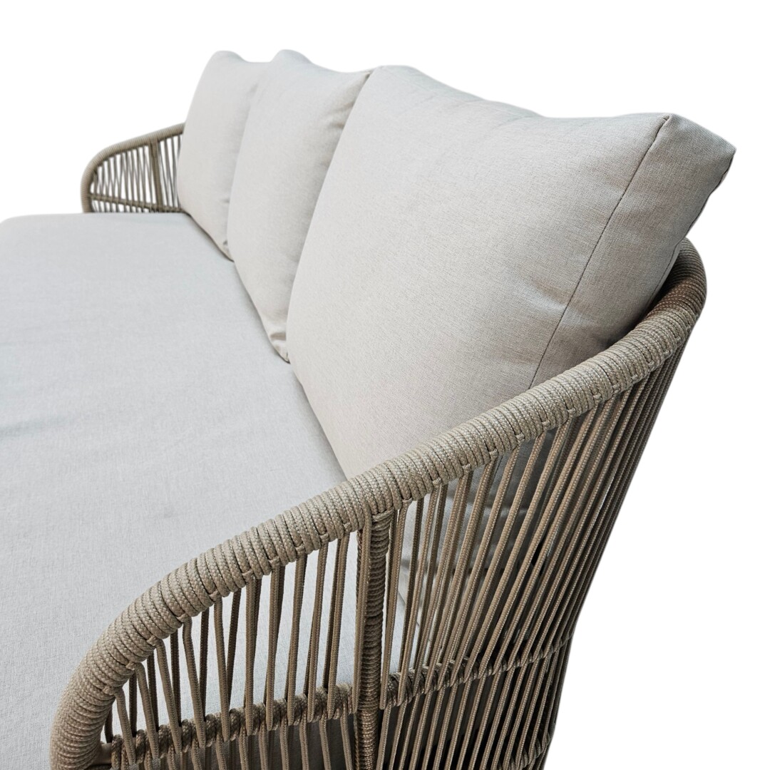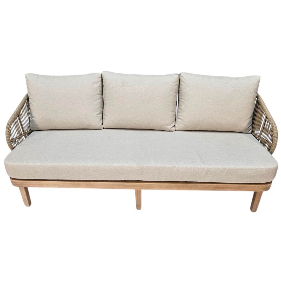 The deep-seated, three-seater sofa and accent chairs are framed in solid Eucalyptus wood and finished with intricate, hand-woven rope backs in a neutral tone, providing a light, airy aesthetic and excellent support