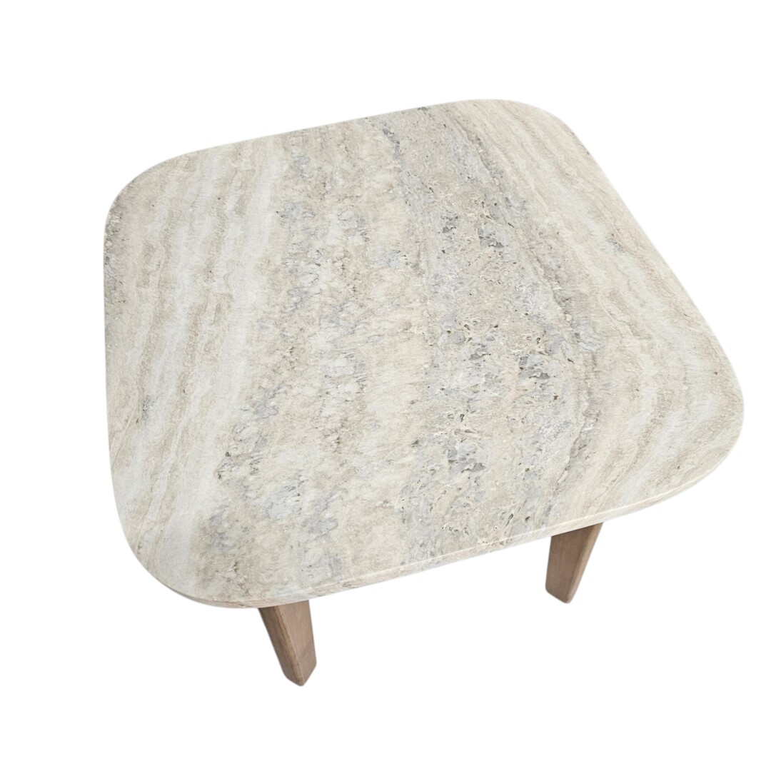 The set is completed with two unique occasional tables—a low, wide coffee table and a smaller accent/side table—both featuring contrasting, patterned wood tops that provide ample surface area for drinks, books, and décor