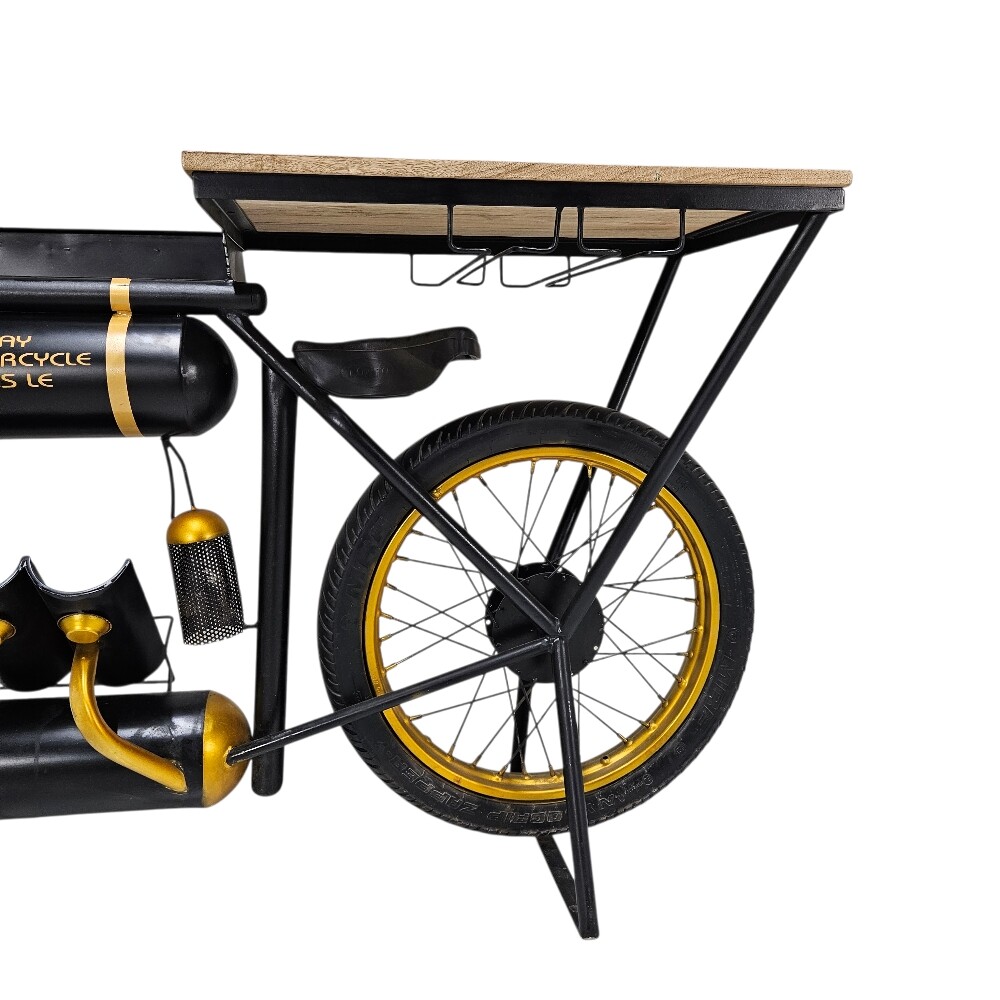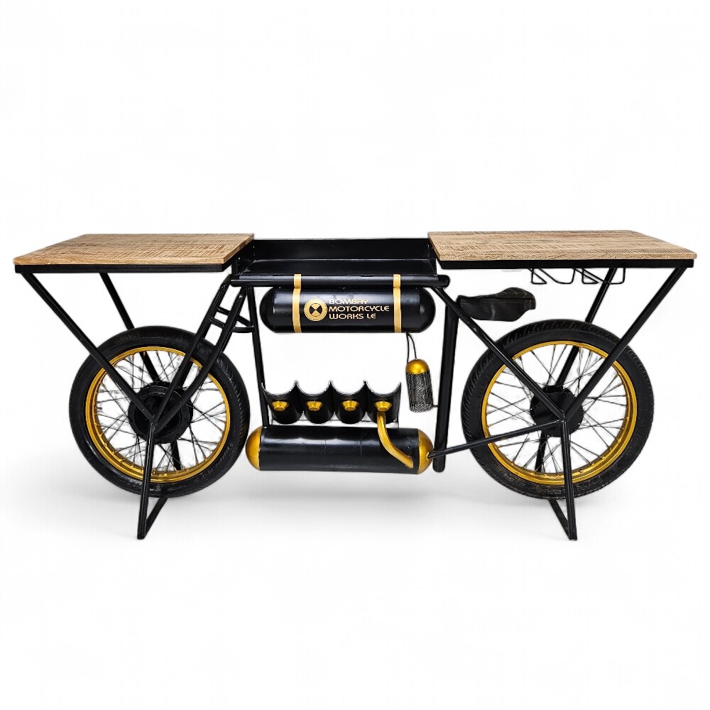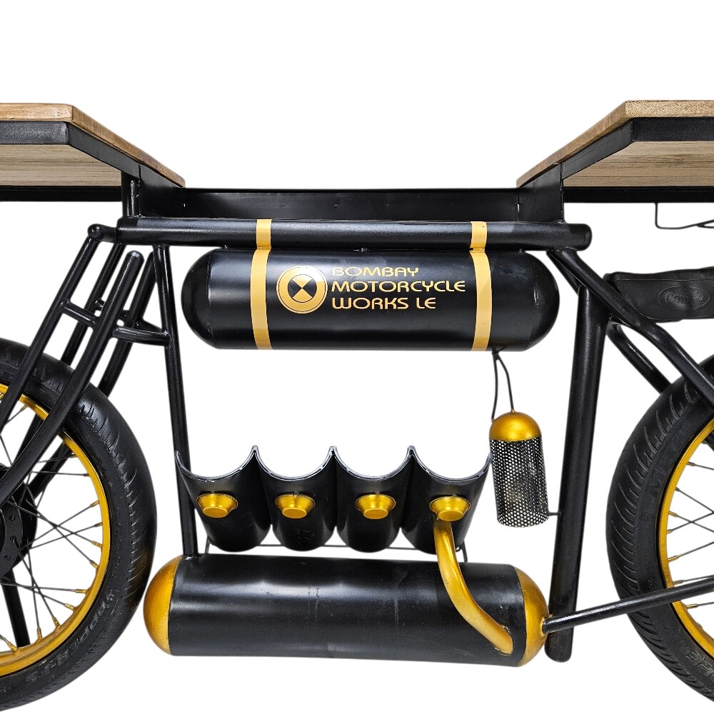 This one-of-a-kind Motorbike Bar Counter is a stunning piece of industrial art and functional furniture, with substantial dimensions of 185 cm (Length) x 46 cm (Depth) x 87 cm (Height)