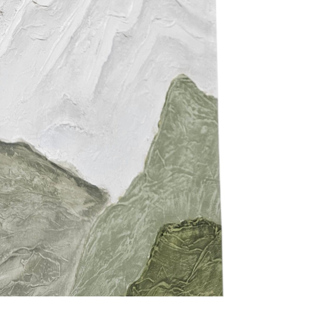 The color palette is a sophisticated blend of earthy sage greens, deep charcoals, and warm taupes, contrasted against crisp, snow-white summits, making it a versatile addition to modern minimalist or Scandinavian-inspired decor