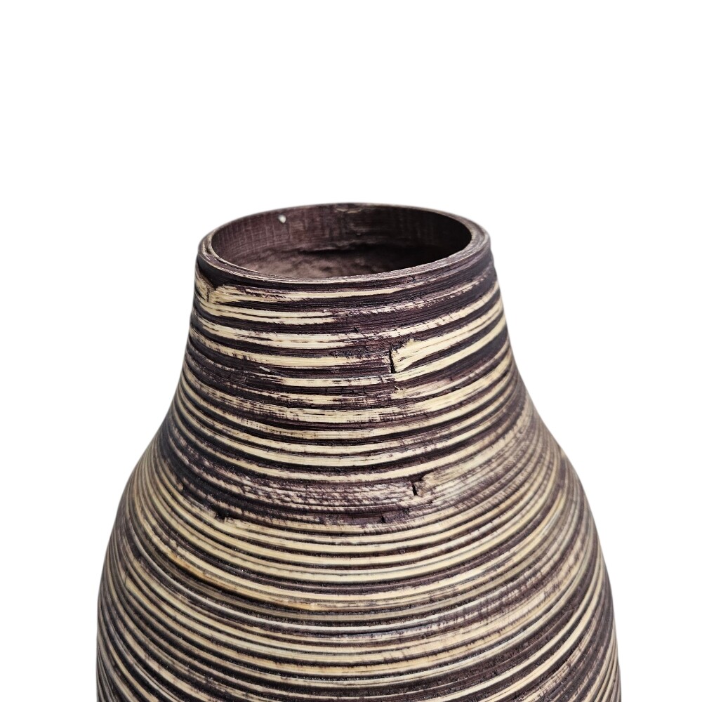 The vase features a distinctive, tapered gourd shape with a narrow opening, making it ideal for displaying tall dried botanicals or standing alone as a striking sculptural centerpiece. It is characterized by its mesmerizing striated pattern, created by alternating bands of deep, warm brown and light, creamy tones that wrap horizontally around the body. This organic design gives the piece a handcrafted feel and a compelling visual texture