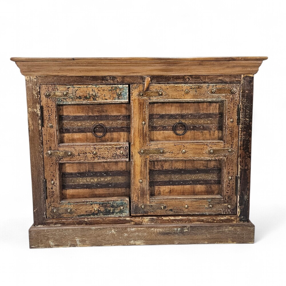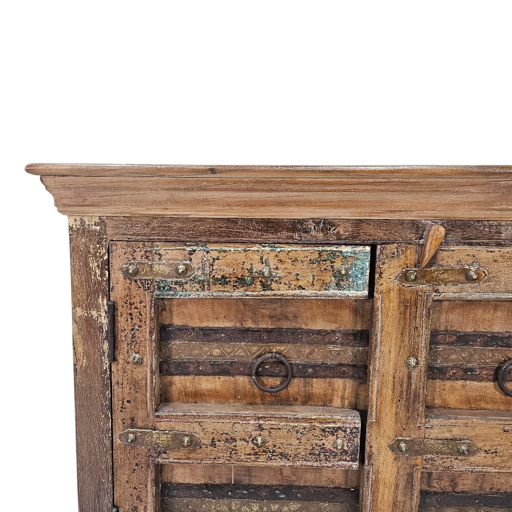 This sideboard is masterfully repurposed from solid mango wood, showcasing a rustic, antique style that breathes new life into traditional architectural elements. Its most striking feature is the two-door front, which utilizes authentic “old door” panels complete with original-style iron strapping, heavy metal studs, and functional ring pull handles