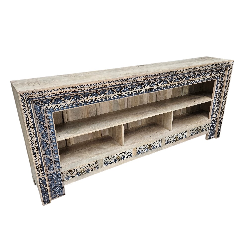 This sideboard embodies a modern-industrial and global-inspired style, characterized by its expansive open-frame design and dark, moody palette. The dramatic height and blue wood finish provide a sophisticated focal point that works beautifully in large dining rooms, entryways, or as a room divider