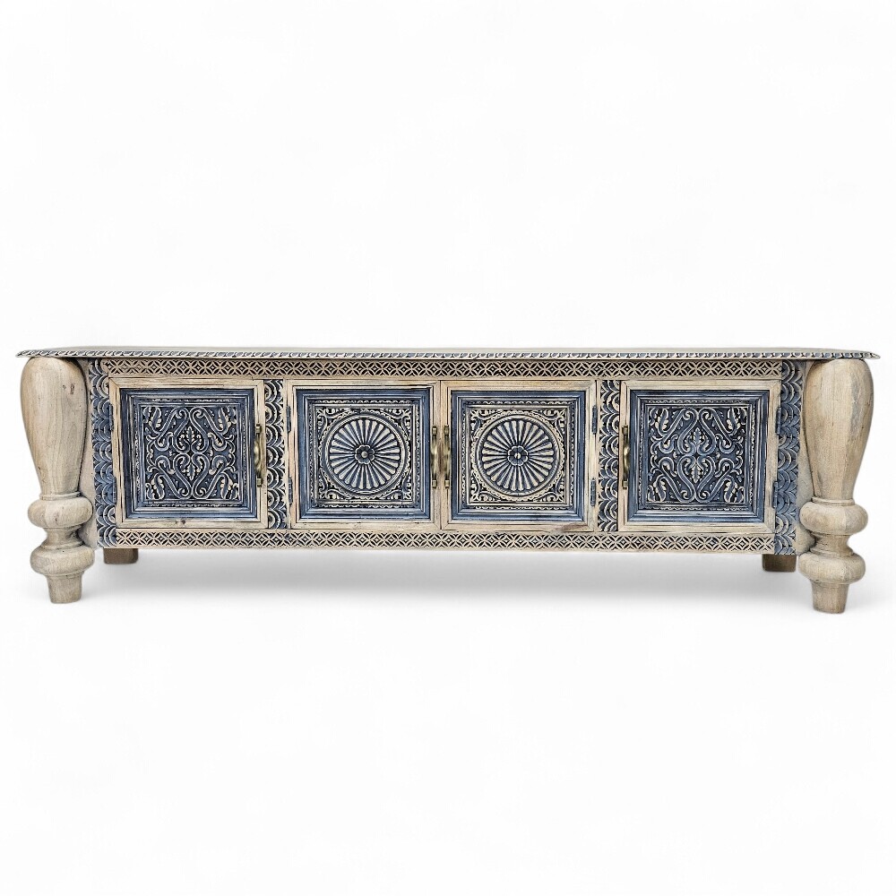 This piece embodies an opulent global-bohemian style, defined by its incredible hand-carved facade