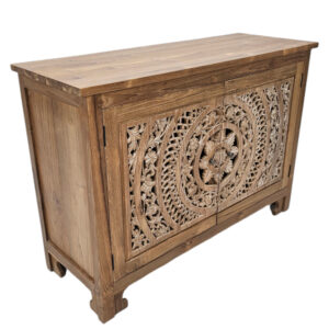 Elevate your interior with the timeless beauty of this carved wooden sideboard, crafted from high-quality teak. Measuring 120 x 45 x 85 cm, this exquisite sideboard showcases intricate hand-carved detailing on its double doors, featuring a mesmerizing circular pattern that draws the eye and adds a touch of artisanal charm to any room