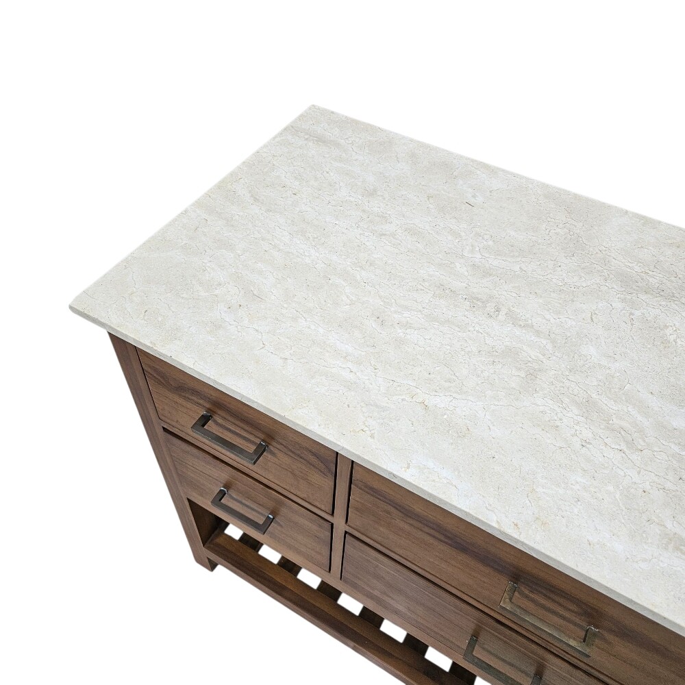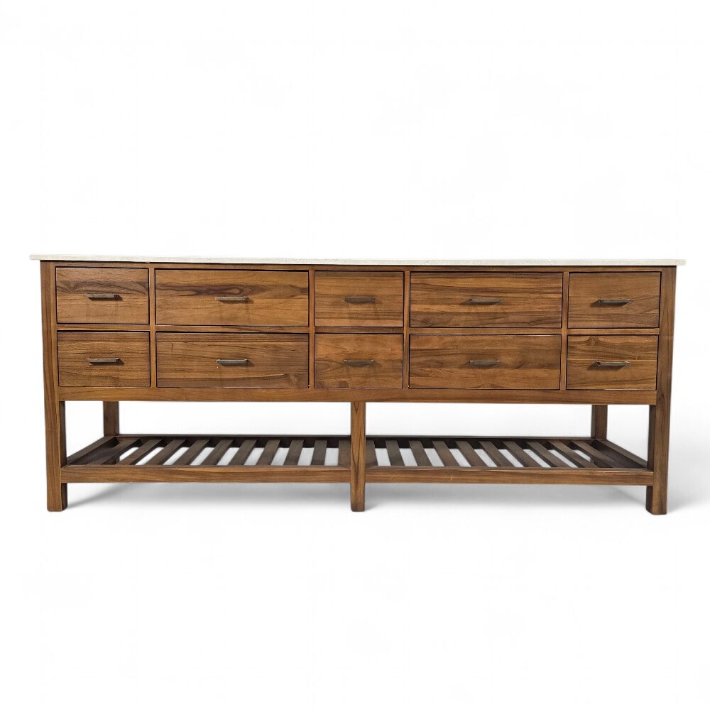 This majestic Parker Teak and Marble Grand Console Table is engineered for maximum impact and utility, making it an ideal statement server for a grand dining room or a feature piece for a long entryway. It offers unrivaled storage capacity and a luxurious aesthetic, blending the warmth of teak with the elegance of natural stone