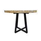 Each slab is unique, with its organic edges and earthy tones preserving the raw beauty of nature. The sturdy black steel base enhances its modern industrial appeal, providing a perfect contrast to the natural stone