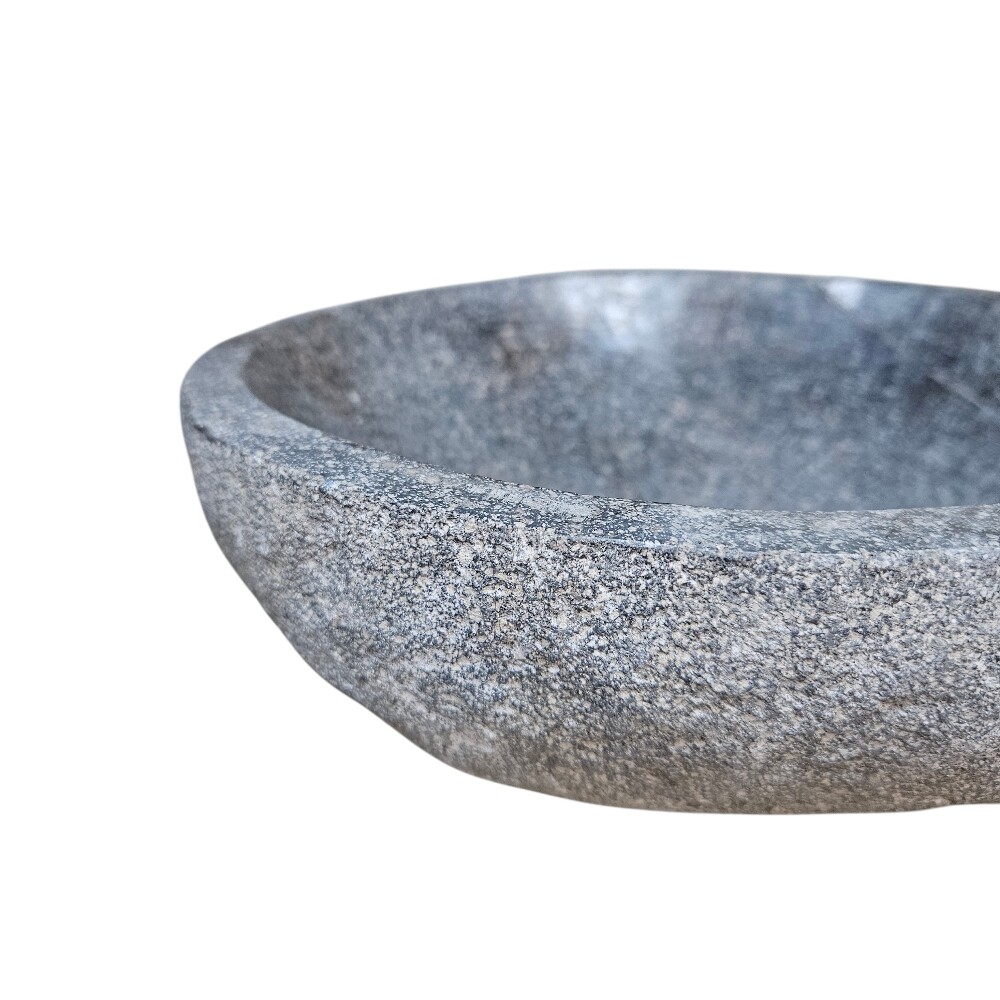 The exterior maintains a rugged, speckled texture in shades of grey and charcoal, while the interior is smoothed to highlight the stone’s dense, cool grain