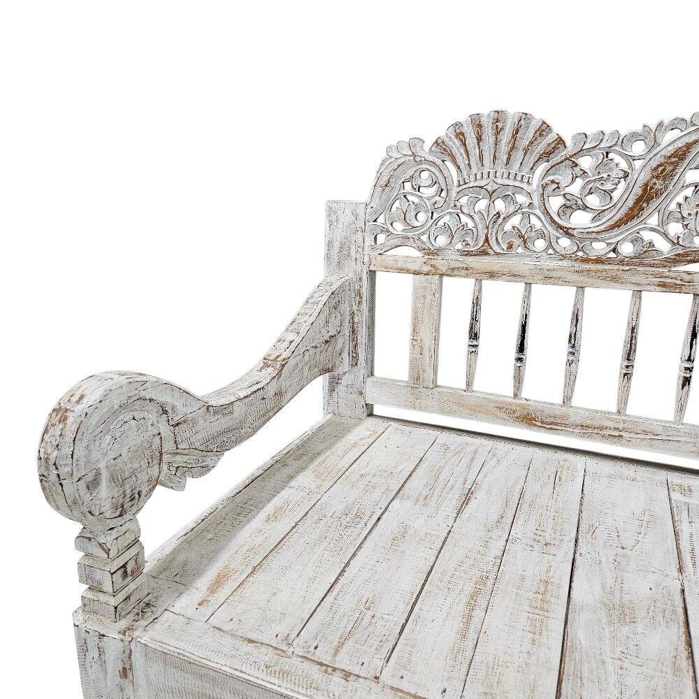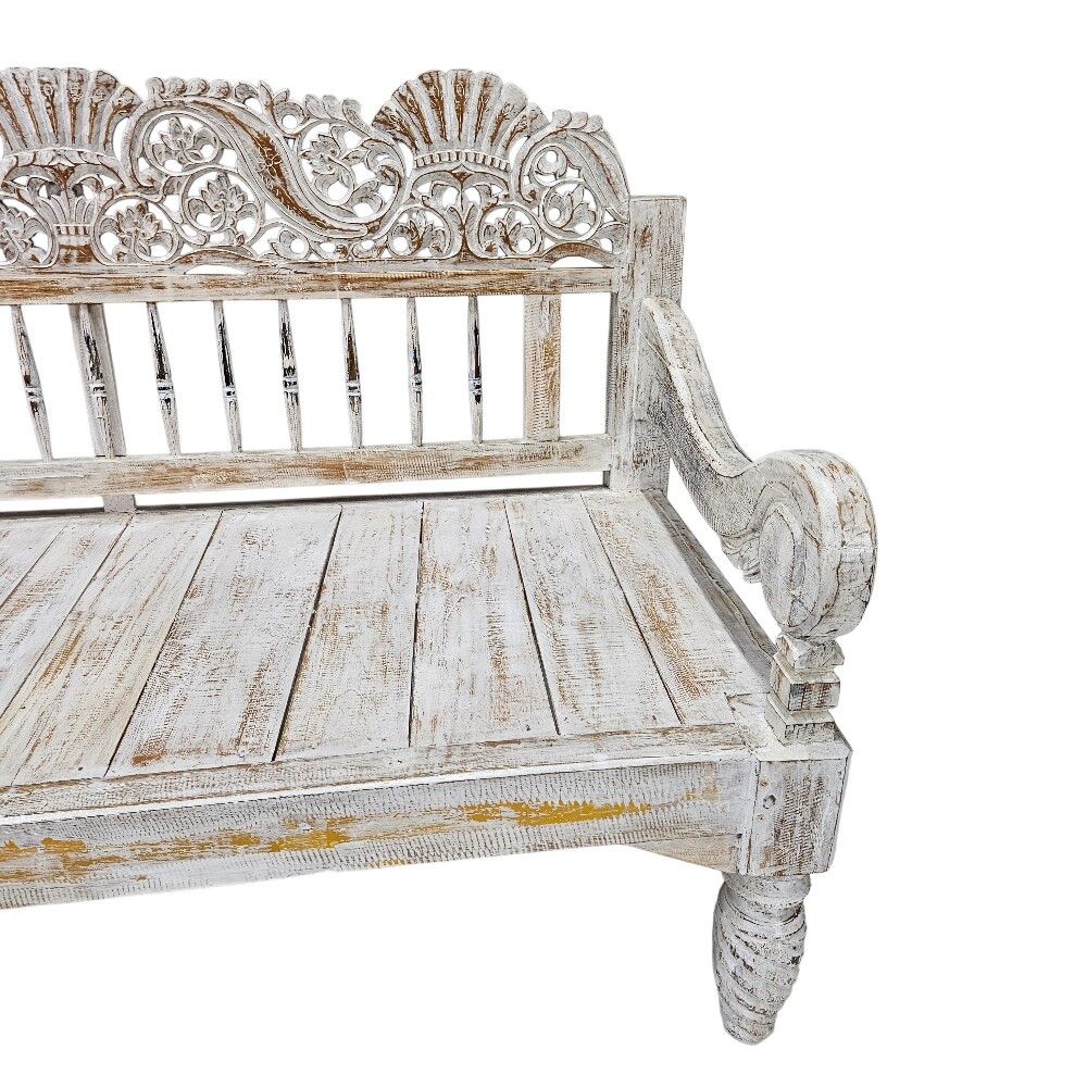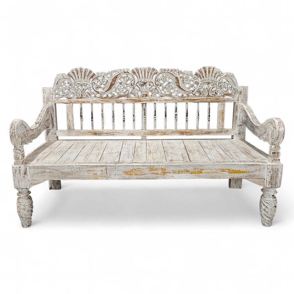 This grand bench is a stunning example of artisanal craftsmanship, featuring an elaborate high-backed design and a beautiful, distressed white-washed finish that lends it a coastal, antique, or rustic Boho elegance