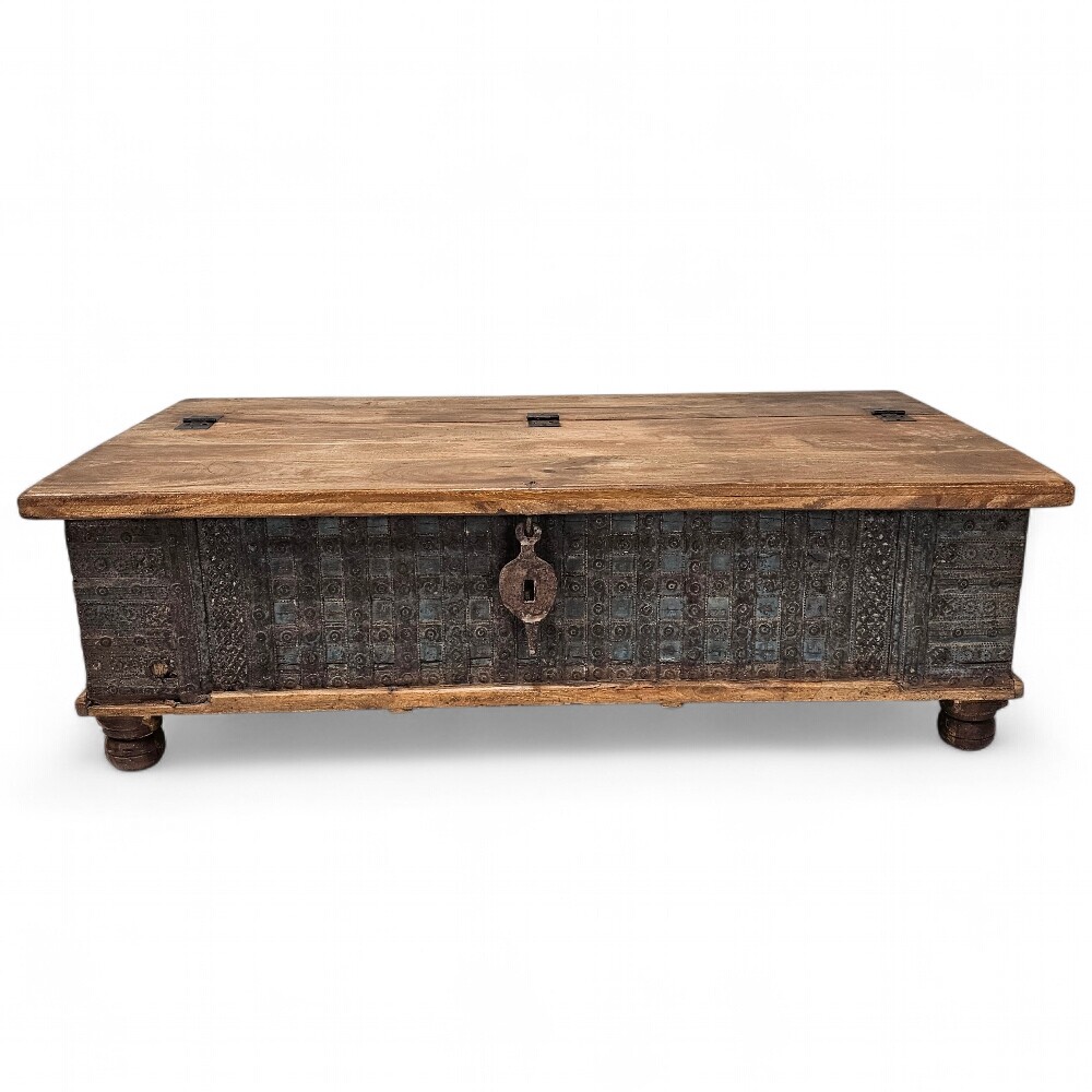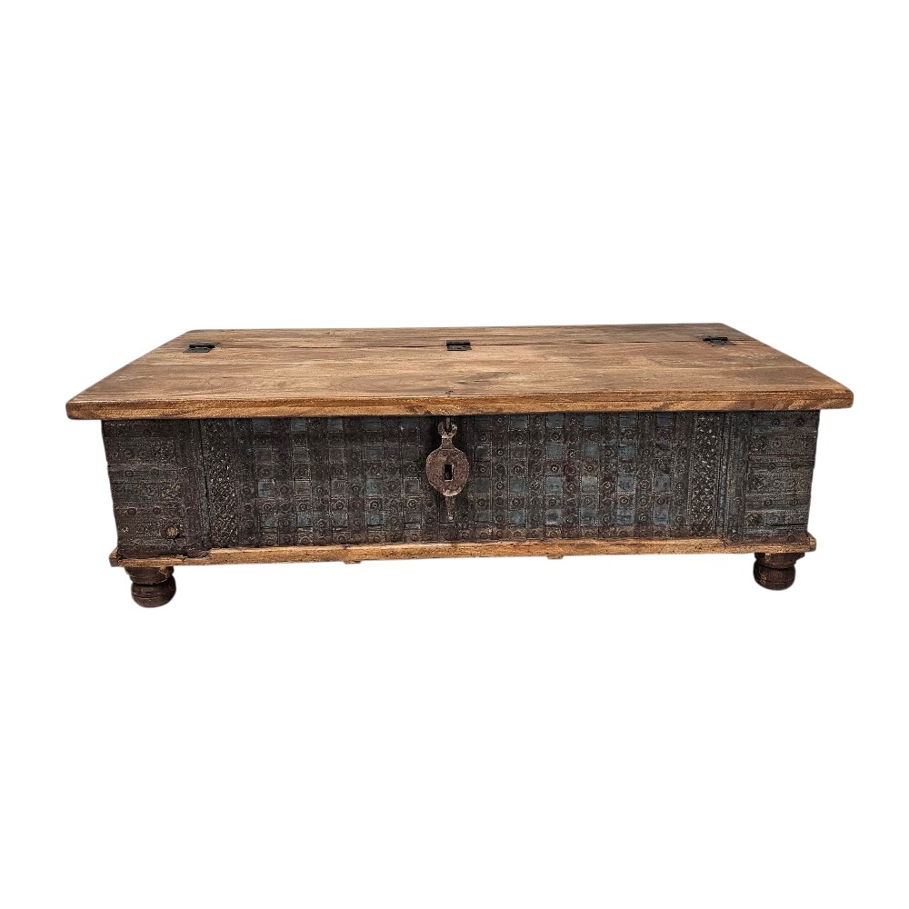 Enhance your living space with the Pitara Coffee Table Storage Trunk, a handcrafted piece that offers the dual benefit of a stylish surface and essential hidden storage to keep your room tidy