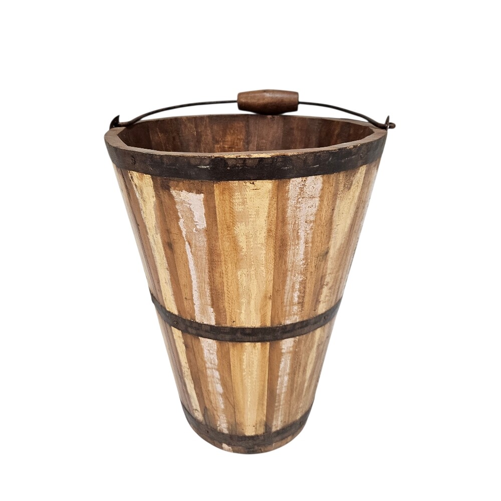 The Sual Rustic Bucket features dimensions of 28cm (Length) x 28cm (Depth) x 35 cm (Height), offering a tall, sturdy profile that serves as a versatile accent for both indoor and outdoor settings. Handcrafted from solid wood, this bucket showcases a weathered aesthetic that highlights the natural grain and texture of the timber
