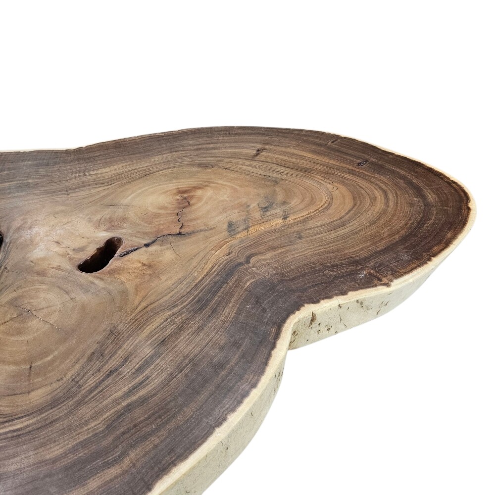 The tabletop is crafted from a single, thick slab of Suar wood, showcasing its natural “live edge” contours and unique grain patterns, including the stunning contrast between the dark heartwood and lighter sapwood. The wood’s interlocking grain structure contributes to its exceptional durability and resistance to cracking