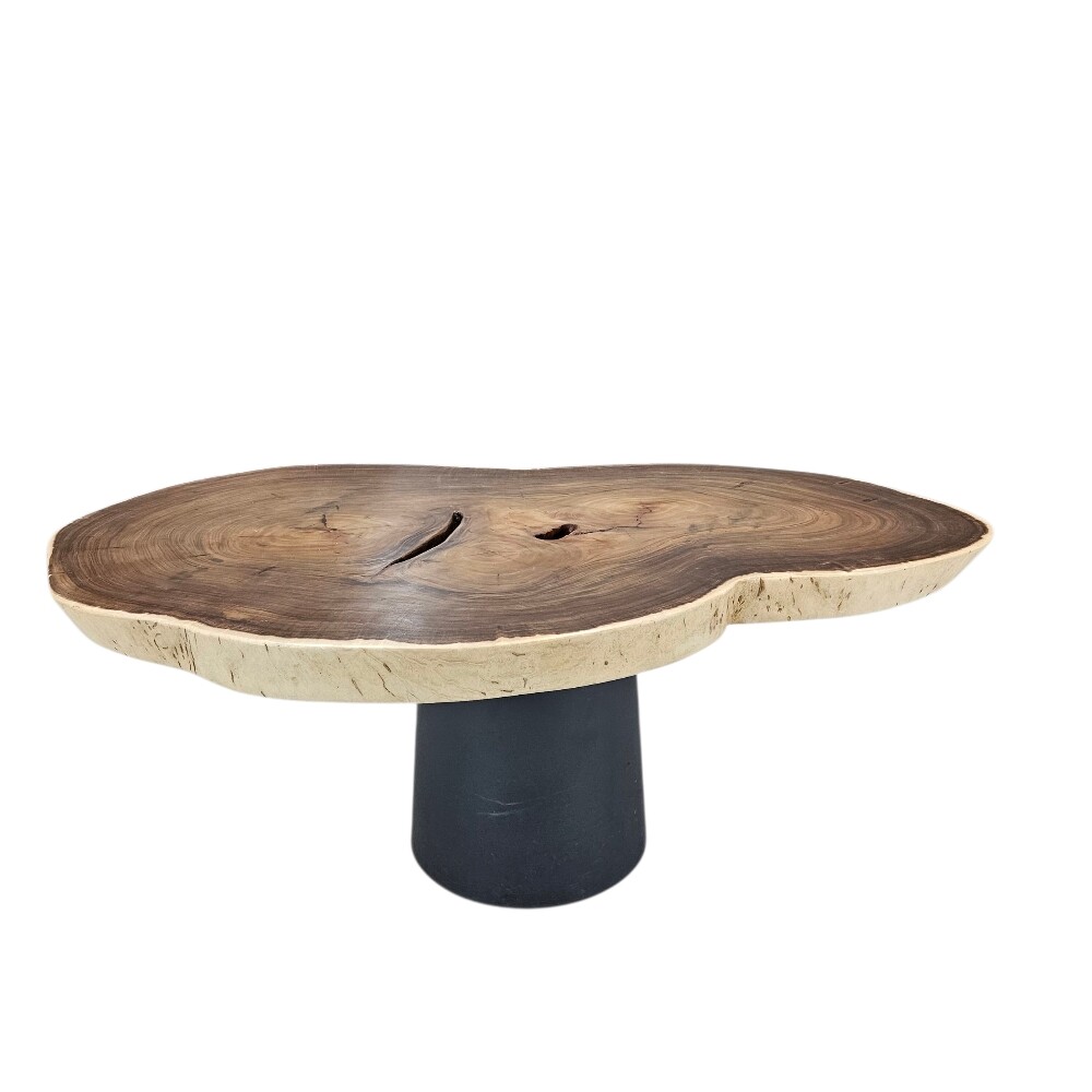 The heavy, sculpted cylindrical black steel pedestal base provides extreme stability and modern contrast. This bold, minimalist base ensures maximum legroom and directs all attention to the organic beauty of the wood slab above