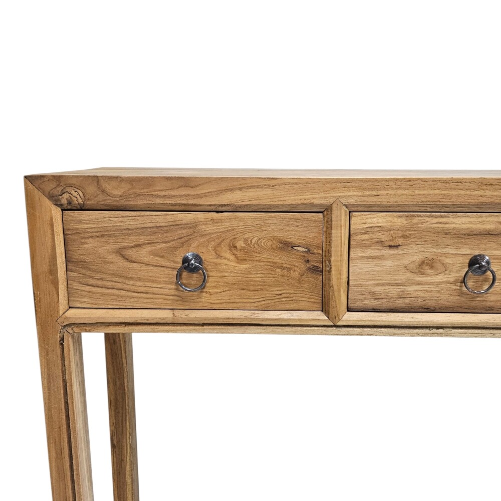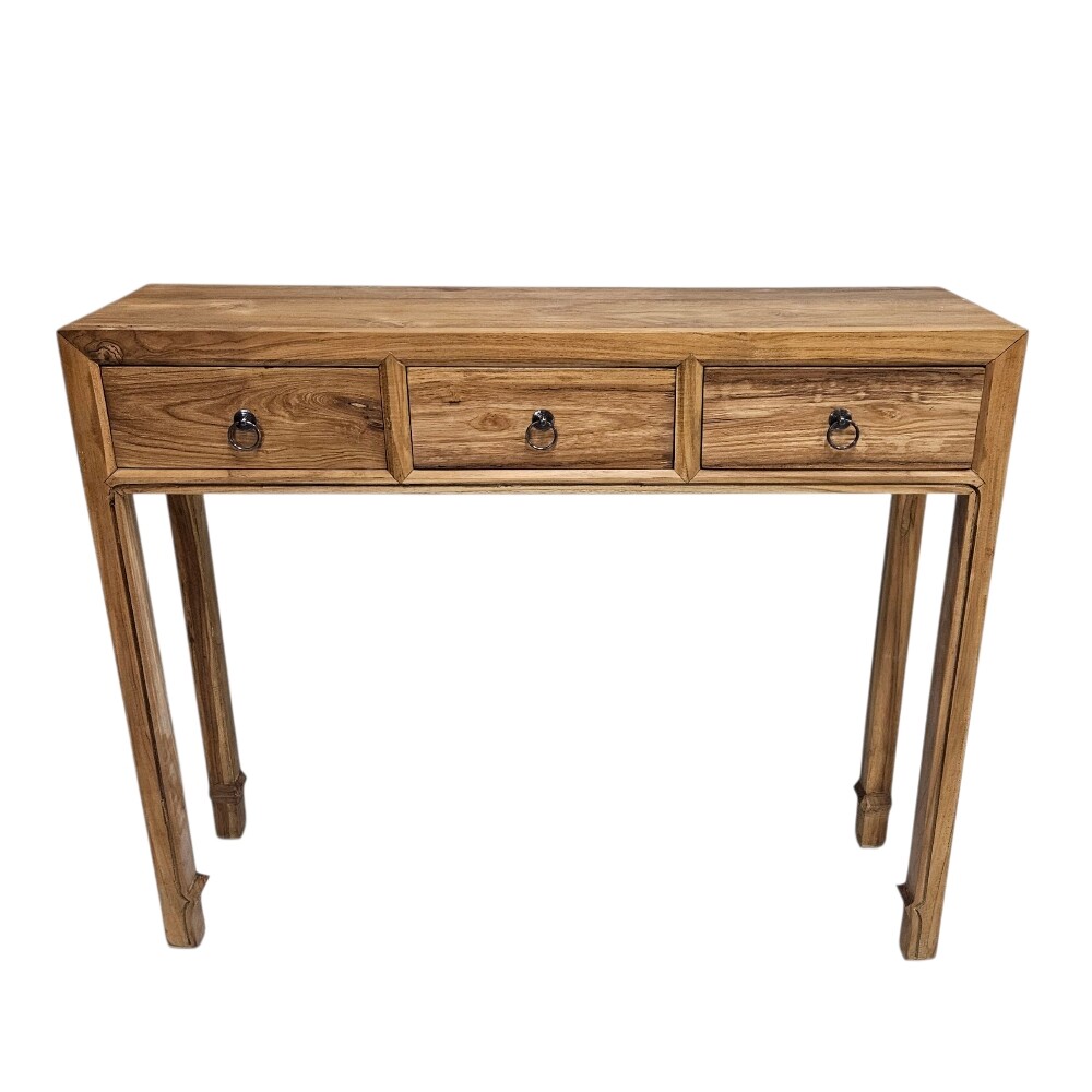 Crafted from solid Teak wood, the Tao console highlights the natural durability and warm grain of the timber. The design features three convenient drawers, each framed beautifully and fitted with traditional dark metal ring pulls that add a classic antique touch