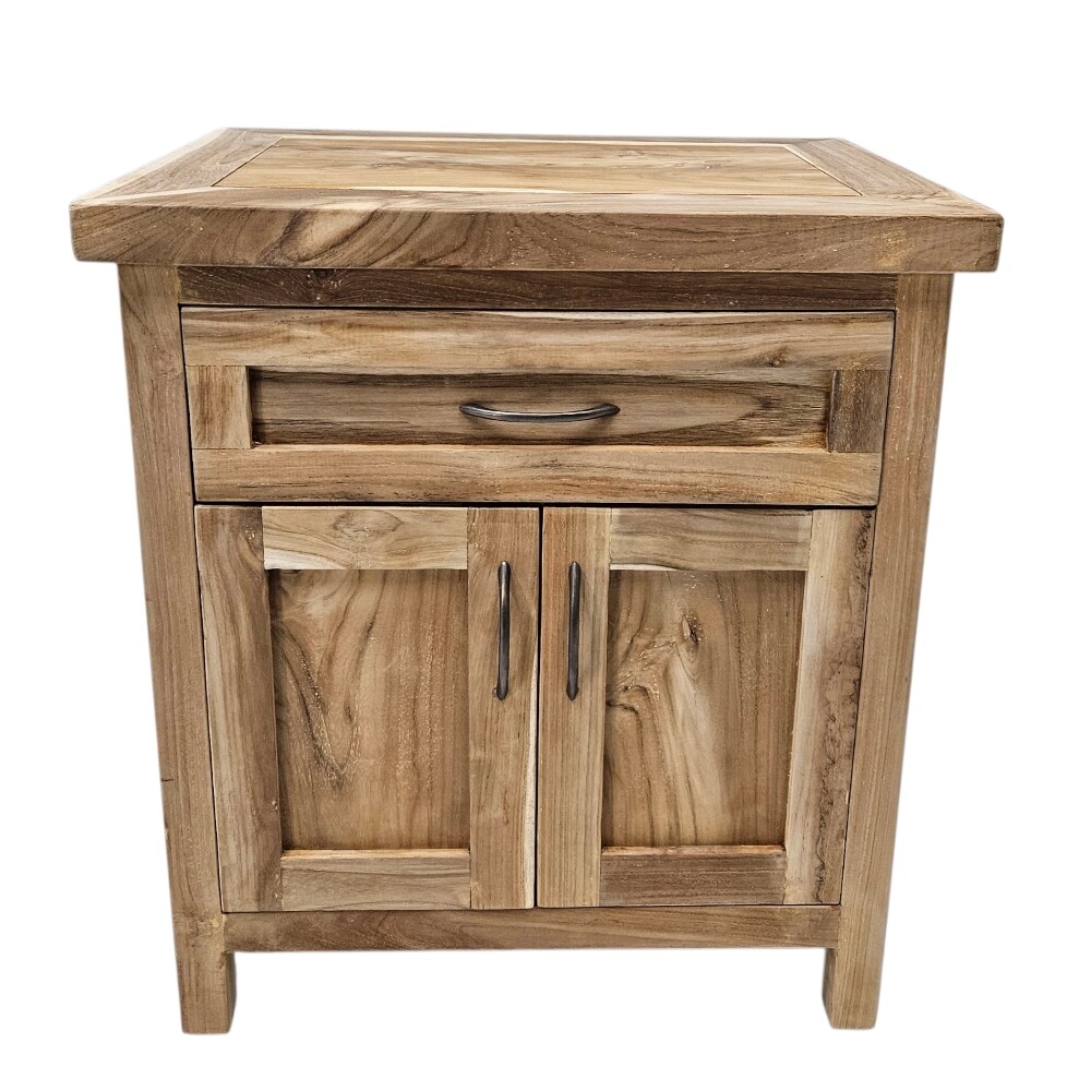 The unit is highly functional, featuring a single top drawer for small essentials and a spacious lower cabinet with twin doors, ensuring a clutter-free environment. Constructed entirely from durable teak, this piece offers lasting reliability while introducing warmth and natural texture to a modern space