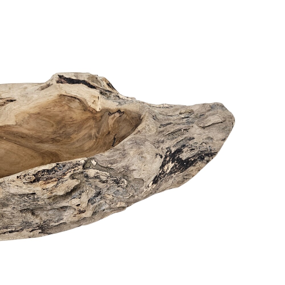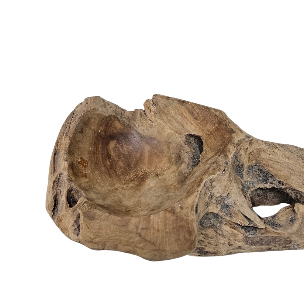 Featuring hand-carved details and a weathered “erosi” texture, this solid teak root bowl showcases unique wood grain patterns and rich golden hues that highlight its authentic, sustainable craftsmanship