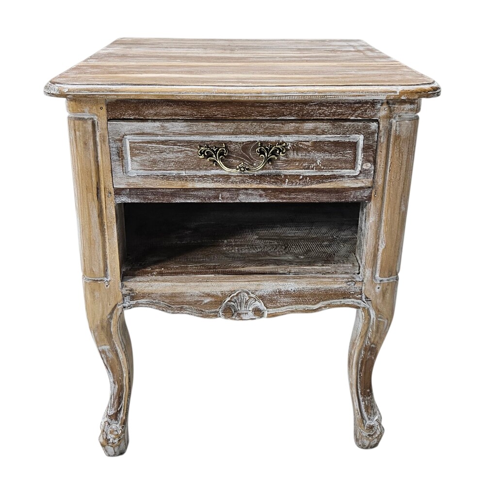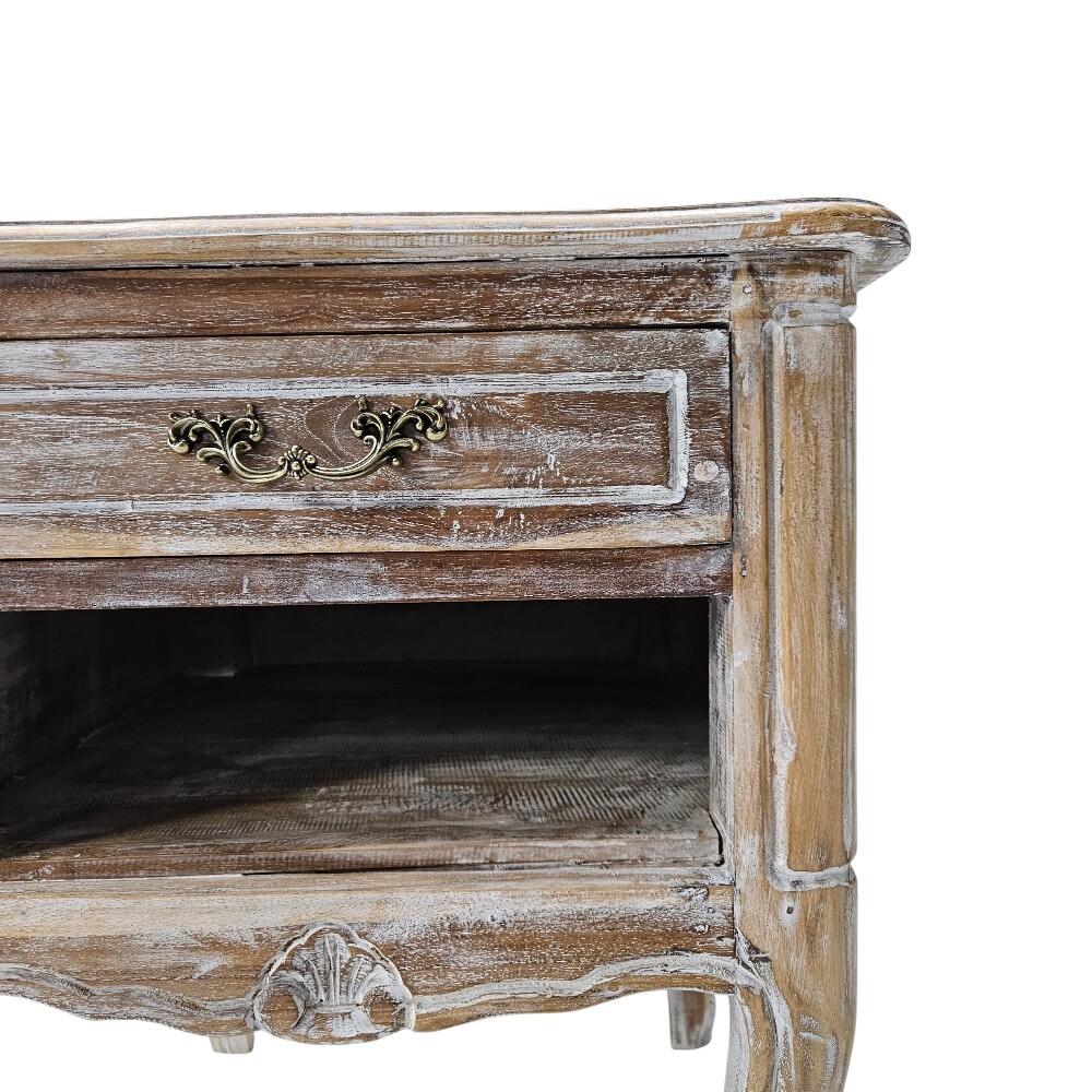 The piece embodies the Farmhouse style with its stunningly distressed, light-wash finish that highlights the natural grain of the teak wood, giving it a beautifully aged patina. It features one pull-out drawer with a decorative antique brass handle for discreet storage and a convenient open shelf below, which is perfect for books or decor