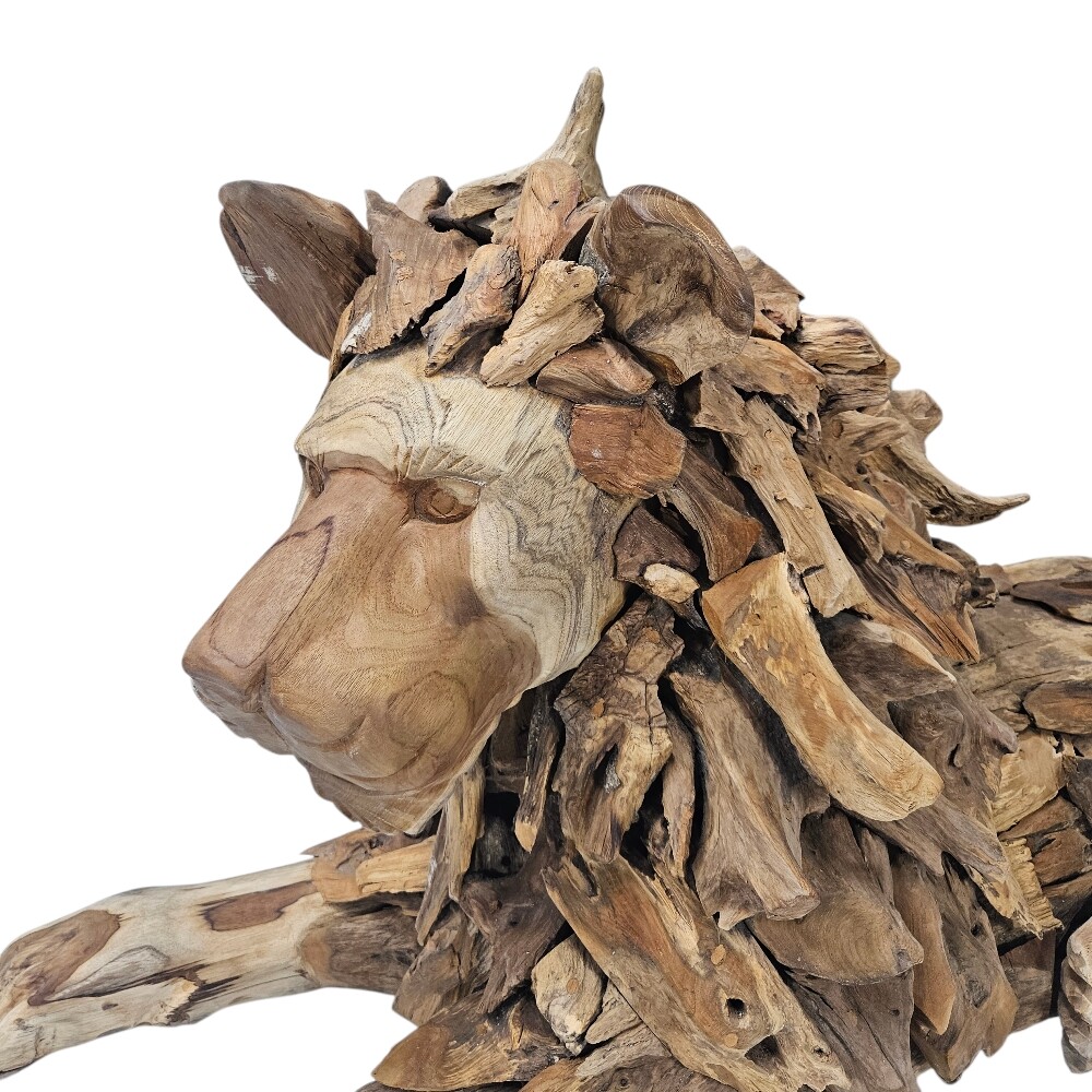 Every lion sculpture is built to last, utilizing the world-renowned durability of high-quality teak wood. Teak is naturally saturated with protective oils, making it incredibly resistant to environmental changes and ensuring the sculpture maintains its integrity for generations. The artisans select each root fragment for its specific shape and grain direction, carefully pinning them together to create a stable, solid structure that feels both lifelike and timeless. Please note that nationwide delivery to your door or collection from your nearest branch is available for all our heavy timber art pieces