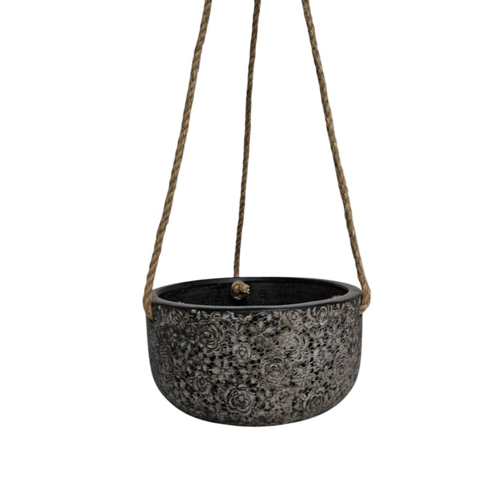 Bring a touch of rustic elegance to your space with the Terra Hanging Ivy Planter Pot. This beautifully crafted 24cm (L) x 24cm (W) x 64 cm (H) planter features an intricate lace-inspired pattern, adding charm and texture to any setting