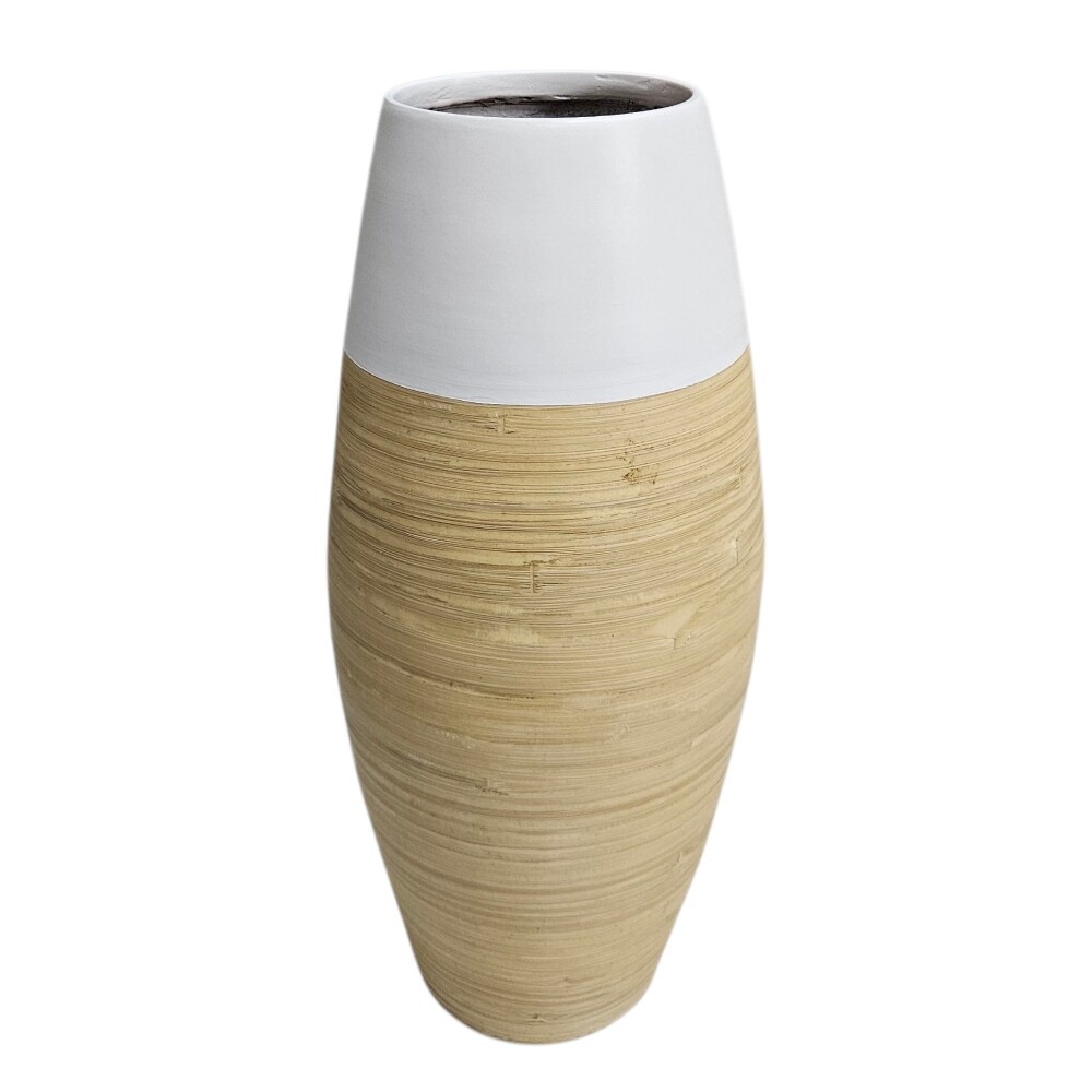 The vase features a tall, elongated, barrel-like shape, making it an excellent statement piece for adding height and visual interest to any setting. Its design is characterized by a distinctive two-tone finish: the lower, larger section showcases a natural, light wood or woven texture with subtle horizontal lines, providing an organic and warm style. This contrasts sharply with the smooth, matte white finish of the upper collar and neck, giving the piece a crisp, contemporary feel