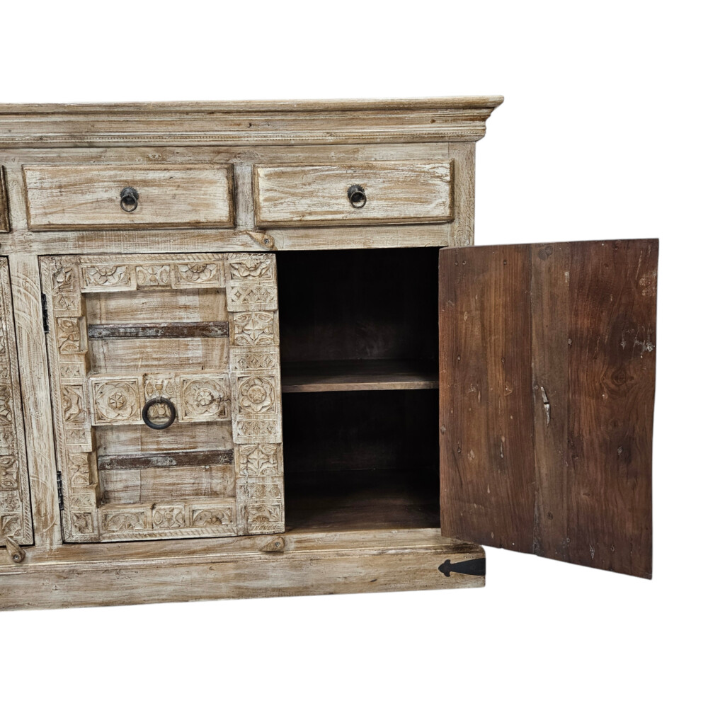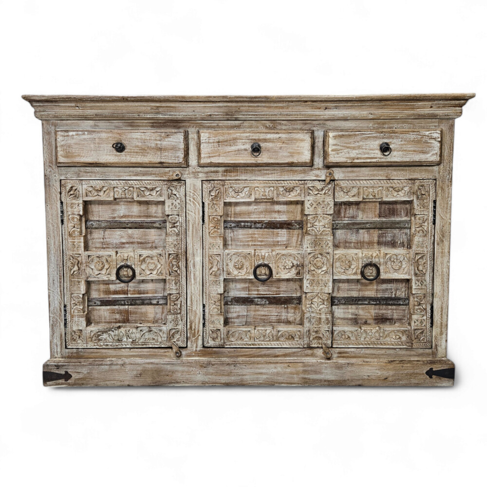 Transform your space with the timeless elegance of the Surati Carved Sideboard. Handcrafted from durable, sustainably sourced mango wood, this piece combines function and artistry with a rustic distressed finish that highlights its intricate detailing