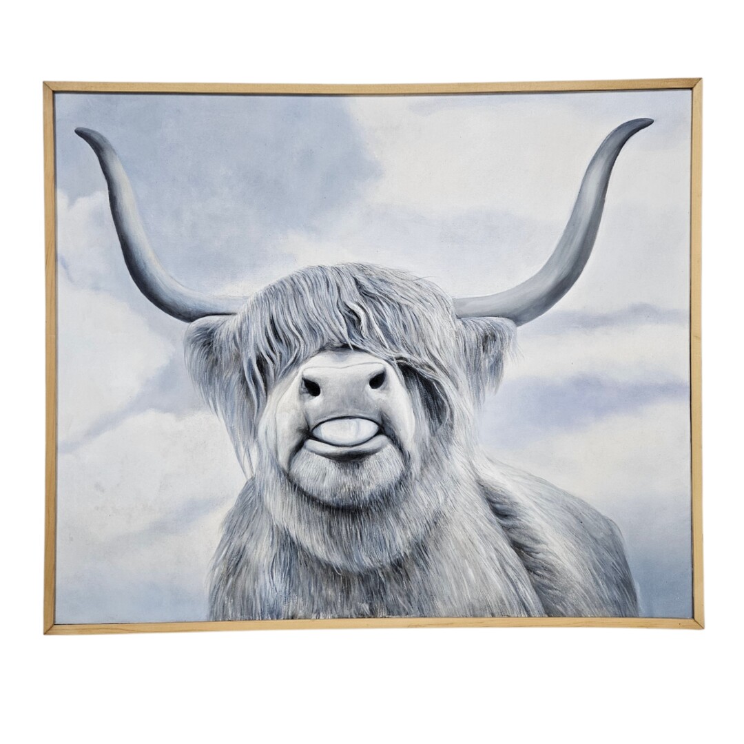 Make a bold statement with this Yack in Snow oil painting, measuring 120 (Length) x 100 cm (Height). Hand-painted with meticulous detail, each piece is a unique work of art, featuring a charming Highland cow set against a soft, atmospheric backdrop that highlights the stunning textures of its shaggy coat.