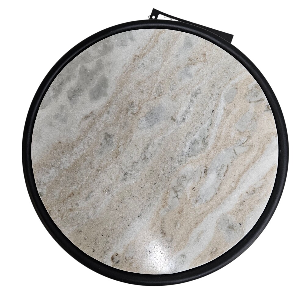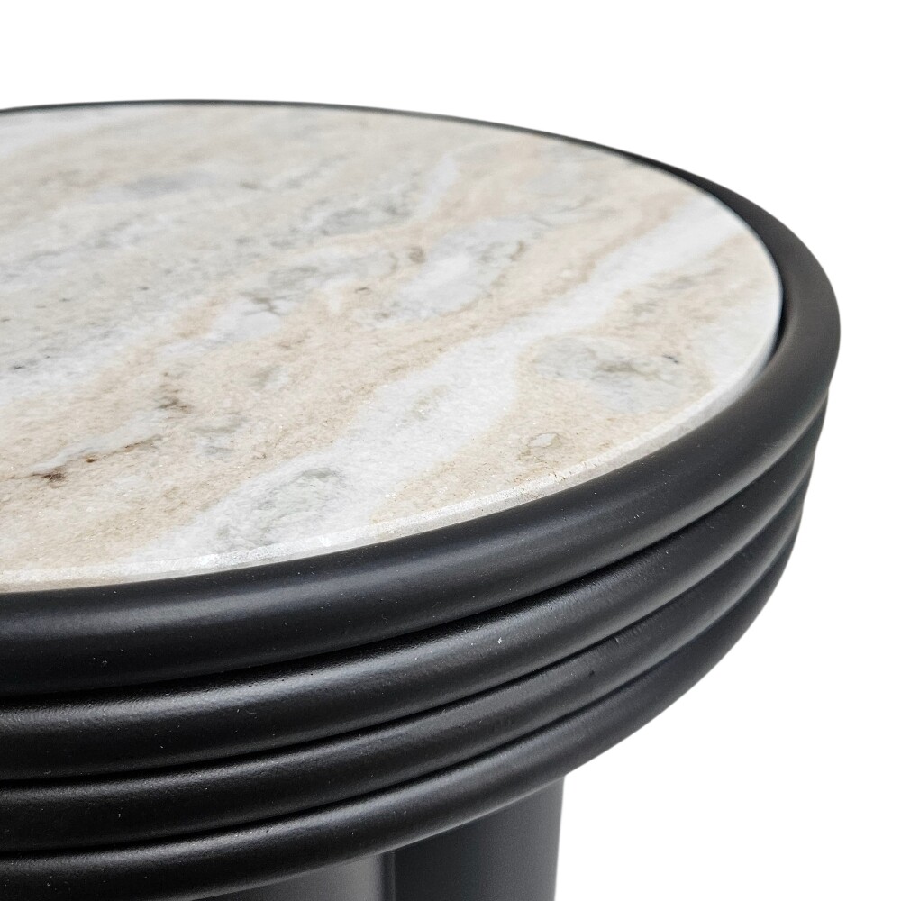 The table boasts a gorgeous round top, showcasing unique natural veining in warm, muted tones of beige, white, and gray, which offers a timeless and elegant style. This contrasts beautifully with the contemporary black iron base, creating a refined, Art Deco-inspired aesthetic