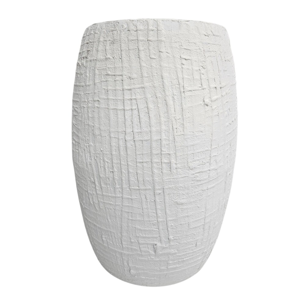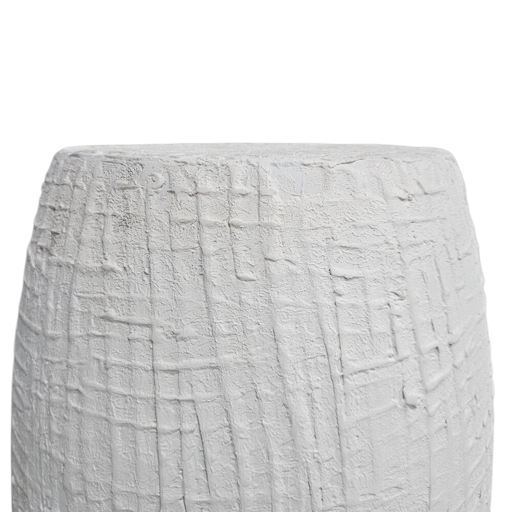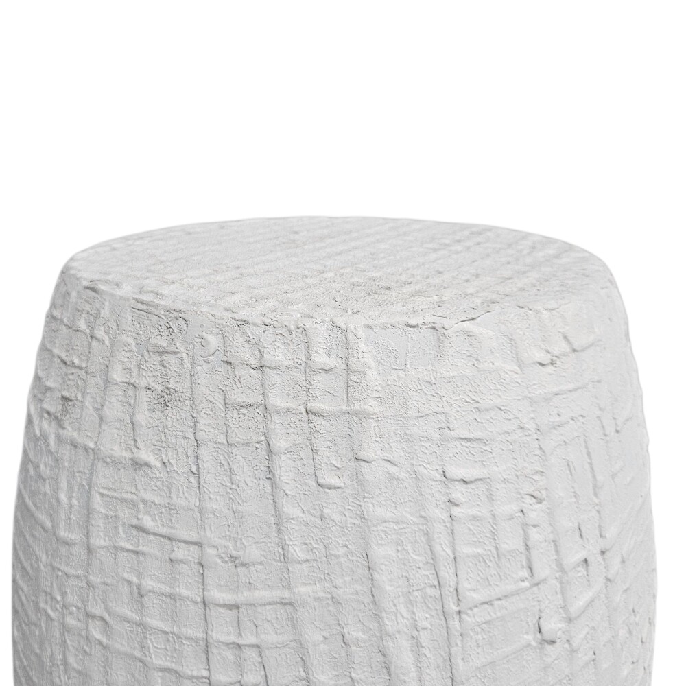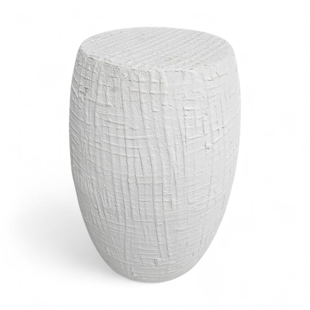 With its eye-catching, textured white finish that resembles a hand-carved drum or tree stump, it offers a raw, artistic feel that adds bold visual interest and unique character to any living space, bedside, or covered patio. The compact, cylindrical form and light weight make it a versatile and easy-to-move accent piece, perfect for small areas where style and function are equally important